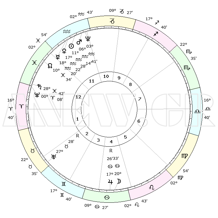 | | ΘΕΣΕΙΣ ΠΛΑΝΗΤΩΝ ΑΣΤΡΟΛΟΓΙΚΟΥ ΧΑΡΤΗ ΤΗΣ ΣΤΙΓΜΗΣ ΑΥΤΗΣ | | | | Πλανήτης | Ζώδιο | Μοίρες | Δεκαήμ. | Σε οίκο | Απόκλιση | | Ακμές των οίκων | | Ηλιος | Υδροχόος | 11°25' | Δεύτερο | 12 | 17 S 21 | | 1ος | 12°58' | Ιχθείς | | Σελήνη | Καρκίνος | 19°43' | Δεύτερο | 5 | 25 N 54 | | 2ος | 26°47' | Κριός | | Ερμής | Υδροχόος | 18°14' | Δεύτερο | 12 | 17 S 11 | | 3ος | 27°02' | Ταύρος | | Αφροδίτη | Υδροχόος | 17°18' | Δεύτερο | 12 | 16 S 56 | | 4ος | 20°20' | Δίδυμοι | | Αρης | Υδροχόος | 06°11' | Πρώτο | 11 | 19 S 44 | | 5ος | 12°07' | Καρκίνος | | Δίας | Καρκίνος | 17°26'R | Δεύτερο | 5 | 22 N 36 | | 6ος | 07°09' | Λέων | | Κρόνος | Ιχθείς | 28°41' | Τρίτο | 1 | 02 S 31 | | 7ος | 12°58' | Παρθένος | | Ουρανός | Ταύρος | 27°28'R | Τρίτο | 3 | 19 N 24 | | 8ος | 26°47' | Ζυγός | | Ποσειδώνας | Κριός | 00°07' | Πρώτο | 1 | 01 S 09 | | 9ος | 27°02' | Σκορπιός | | Πλούτωνας | Υδροχόος | 03°41' | Πρώτο | 11 | 23 S 02 | | 10ος | 20°20' | Τοξότης | | Β. Δεσμός | Ιχθείς | 10°34' | Δεύτερο | 12 | 07 S 36 | | 11ος | 12°07' | Αιγόκερως | | Ωροσκόπος | Ιχθείς | 12°58' | Δεύτερο | | | 12ος | 07°09' | Υδροχόος | | Μεσουράνημα | Τοξότης | 20°20' | Τρίτο | | | |
