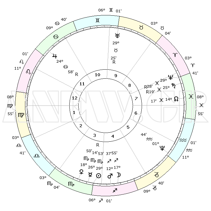 | | ΘΕΣΕΙΣ ΠΛΑΝΗΤΩΝ ΑΣΤΡΟΛΟΓΙΚΟΥ ΧΑΡΤΗ ΤΗΣ ΣΤΙΓΜΗΣ ΑΥΤΗΣ | | | | Πλανήτης | Ζώδιο | Μοίρες | Δεκαήμ. | Σε οίκο | Απόκλιση | | Ακμές των οίκων | | Ηλιος | Σκορπιός | 29°49' | Τρίτο | 4 | 20 S 06 | | 1ος | 22°45' | Λέων | | Σελήνη | Τοξότης | 17°15' | Δεύτερο | 4 | 27 S 48 | | 2ος | 15°50' | Παρθένος | | Ερμής | Σκορπιός | 26°18'R | Τρίτο | 4 | 18 S 19 | | 3ος | 13°47' | Ζυγός | | Αφροδίτη | Σκορπιός | 18°45' | Δεύτερο | 4 | 16 S 26 | | 4ος | 16°33' | Σκορπιός | | Αρης | Τοξότης | 12°35' | Δεύτερο | 4 | 22 S 53 | | 5ος | 21°16' | Τοξότης | | Δίας | Καρκίνος | 24°59'R | Τρίτο | 12 | 21 N 16 | | 6ος | 23°52' | Αιγόκερως | | Κρόνος | Ιχθείς | 25°19'R | Τρίτο | 8 | 04 S 04 | | 7ος | 22°45' | Υδροχόος | | Ουρανός | Ταύρος | 29°25'R | Τρίτο | 10 | 19 N 49 | | 8ος | 15°50' | Ιχθείς | | Ποσειδώνας | Ιχθείς | 29°28'R | Τρίτο | 8 | 01 S 27 | | 9ος | 13°47' | Κριός | | Πλούτωνας | Υδροχόος | 01°44' | Πρώτο | 6 | 23 S 27 | | 10ος | 16°33' | Ταύρος | | Β. Δεσμός | Ιχθείς | 14°18' | Δεύτερο | 7 | 06 S 11 | | 11ος | 21°16' | Δίδυμοι | | Ωροσκόπος | Λέων | 22°45' | Τρίτο | | | 12ος | 23°52' | Καρκίνος | | Μεσουράνημα | Ταύρος | 16°33' | Δεύτερο | | | |
