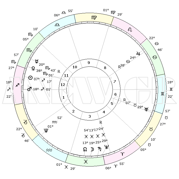 | | ΘΕΣΕΙΣ ΠΛΑΝΗΤΩΝ ΑΣΤΡΟΛΟΓΙΚΟΥ ΧΑΡΤΗ ΤΗΣ ΣΤΙΓΜΗΣ ΑΥΤΗΣ | | | | Πλανήτης | Ζώδιο | Μοίρες | Δεκαήμ. | Σε οίκο | Απόκλιση | | Ακμές των οίκων | | Ηλιος | Τοξότης | 07°13' | Πρώτο | 1 | 21 S 31 | | 1ος | 01°17' | Τοξότης | | Σελήνη | Ιχθείς | 18°27' | Δεύτερο | 4 | 04 S 14 | | 2ος | 02°35' | Αιγόκερως | | Ερμής | Σκορπιός | 20°44'R | Τρίτο | 12 | 15 S 31 | | 3ος | 08°30' | Υδροχόος | | Αφροδίτη | Σκορπιός | 27°57' | Τρίτο | 12 | 18 S 57 | | 4ος | 14°35' | Ιχθείς | | Αρης | Τοξότης | 17°58' | Δεύτερο | 1 | 23 S 32 | | 5ος | 15°27' | Κριός | | Δίας | Καρκίνος | 24°38'R | Τρίτο | 8 | 21 N 21 | | 6ος | 10°20' | Ταύρος | | Κρόνος | Ιχθείς | 25°17' | Τρίτο | 4 | 04 S 03 | | 7ος | 01°17' | Δίδυμοι | | Ουρανός | Ταύρος | 29°07'R | Τρίτο | 6 | 19 N 45 | | 8ος | 02°35' | Καρκίνος | | Ποσειδώνας | Ιχθείς | 29°24'R | Τρίτο | 4 | 01 S 29 | | 9ος | 08°30' | Λέων | | Πλούτωνας | Υδροχόος | 01°52' | Πρώτο | 2 | 23 S 25 | | 10ος | 14°35' | Παρθένος | | Β. Δεσμός | Ιχθείς | 13°54' | Δεύτερο | 3 | 06 S 20 | | 11ος | 15°27' | Ζυγός | | Ωροσκόπος | Τοξότης | 01°17' | Πρώτο | | | 12ος | 10°20' | Σκορπιός | | Μεσουράνημα | Παρθένος | 14°35' | Δεύτερο | | | |