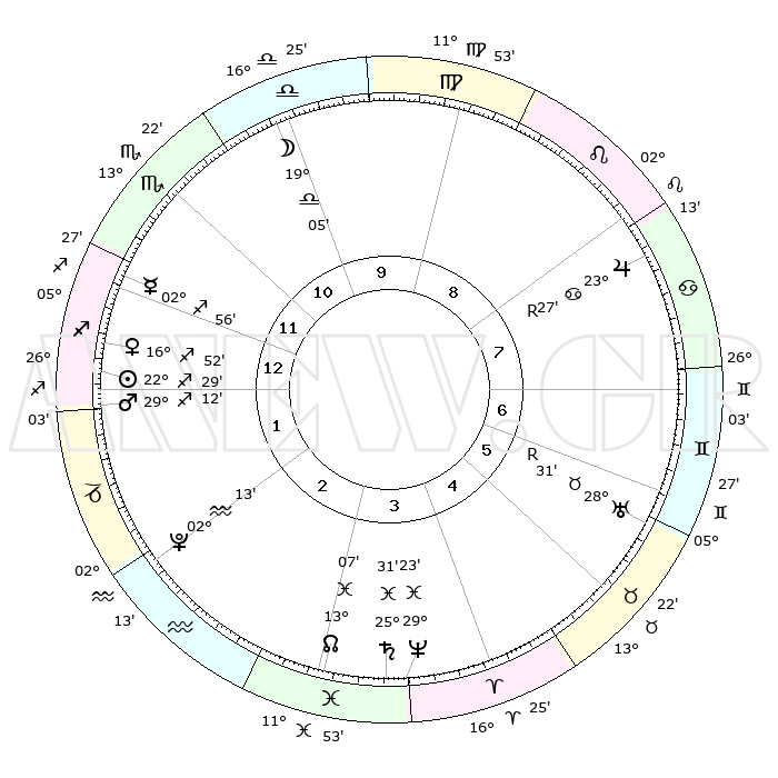 | | ΘΕΣΕΙΣ ΠΛΑΝΗΤΩΝ ΑΣΤΡΟΛΟΓΙΚΟΥ ΧΑΡΤΗ ΤΗΣ ΣΤΙΓΜΗΣ ΑΥΤΗΣ | | | | Πλανήτης | Ζώδιο | Μοίρες | Δεκαήμ. | Σε οίκο | Απόκλιση | | Ακμές των οίκων | | Ηλιος | Τοξότης | 22°18' | Τρίτο | 2 | 23 S 13 | | 1ος | 03°04' | Σκορπιός | | Σελήνη | Ζυγός | 16°57' | Δεύτερο | 12 | 09 S 15 | | 2ος | 01°40' | Τοξότης | | Ερμής | Τοξότης | 02°42' | Πρώτο | 2 | 19 S 04 | | 3ος | 03°52' | Αιγόκερως | | Αφροδίτη | Τοξότης | 16°39' | Δεύτερο | 2 | 22 S 34 | | 4ος | 08°17' | Υδροχόος | | Αρης | Τοξότης | 29°04' | Τρίτο | 2 | 24 S 12 | | 5ος | 11°09' | Ιχθείς | | Δίας | Καρκίνος | 23°28'R | Τρίτο | 9 | 21 N 35 | | 6ος | 09°32' | Κριός | | Κρόνος | Ιχθείς | 25°30' | Τρίτο | 5 | 03 S 55 | | 7ος | 03°04' | Ταύρος | | Ουρανός | Ταύρος | 28°32'R | Τρίτο | 7 | 19 N 38 | | 8ος | 01°40' | Δίδυμοι | | Ποσειδώνας | Ιχθείς | 29°23' | Τρίτο | 5 | 01 S 29 | | 9ος | 03°52' | Καρκίνος | | Πλούτωνας | Υδροχόος | 02°13' | Πρώτο | 3 | 23 S 20 | | 10ος | 08°17' | Λέων | | Β. Δεσμός | Ιχθείς | 13°07' | Δεύτερο | 5 | 06 S 38 | | 11ος | 11°09' | Παρθένος | | Ωροσκόπος | Σκορπιός | 03°04' | Πρώτο | | | 12ος | 09°32' | Ζυγός | | Μεσουράνημα | Λέων | 08°17' | Πρώτο | | | |