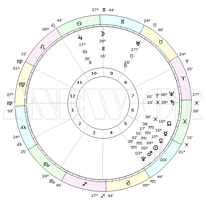 | | ΘΕΣΕΙΣ ΠΛΑΝΗΤΩΝ ΑΣΤΡΟΛΟΓΙΚΟΥ ΧΑΡΤΗ ΤΗΣ ΣΤΙΓΜΗΣ ΑΥΤΗΣ | | | | Πλανήτης | Ζώδιο | Μοίρες | Δεκαήμ. | Σε οίκο | Απόκλιση | | Ακμές των οίκων | | Ηλιος | Υδροχόος | 09°50' | Πρώτο | 6 | 17 S 47 | | 1ος | 04°19' | Παρθένος | | Σελήνη | Δίδυμοι | 27°05' | Τρίτο | 10 | 28 N 21 | | 2ος | 28°37' | Παρθένος | | Ερμής | Υδροχόος | 15°30' | Δεύτερο | 6 | 18 S 05 | | 3ος | 27°39' | Ζυγός | | Αφροδίτη | Υδροχόος | 15°21' | Δεύτερο | 6 | 17 S 30 | | 4ος | 00°36' | Τοξότης | | Αρης | Υδροχόος | 04°58' | Πρώτο | 5 | 20 S 01 | | 5ος | 04°31' | Αιγόκερως | | Δίας | Καρκίνος | 17°37'R | Δεύτερο | 11 | 22 N 34 | | 6ος | 06°09' | Υδροχόος | | Κρόνος | Ιχθείς | 28°32' | Τρίτο | 7 | 02 S 35 | | 7ος | 04°19' | Ιχθείς | | Ουρανός | Ταύρος | 27°28'R | Τρίτο | 9 | 19 N 24 | | 8ος | 28°37' | Ιχθείς | | Ποσειδώνας | Κριός | 00°05' | Πρώτο | 8 | 01 S 11 | | 9ος | 27°39' | Κριός | | Πλούτωνας | Υδροχόος | 03°38' | Πρώτο | 5 | 23 S 02 | | 10ος | 00°36' | Δίδυμοι | | Β. Δεσμός | Ιχθείς | 10°39' | Δεύτερο | 7 | 07 S 34 | | 11ος | 04°31' | Καρκίνος | | Ωροσκόπος | Παρθένος | 04°19' | Πρώτο | | | 12ος | 06°09' | Λέων | | Μεσουράνημα | Δίδυμοι | 00°36' | Πρώτο | | | |