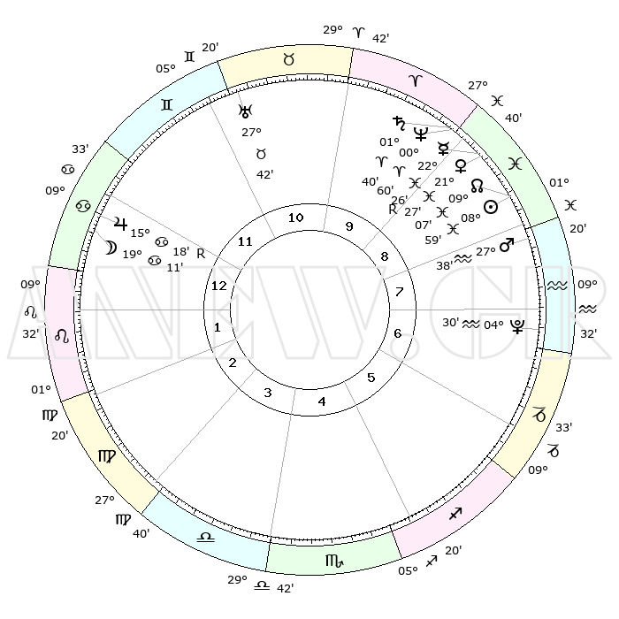 | | ΘΕΣΕΙΣ ΠΛΑΝΗΤΩΝ ΑΣΤΡΟΛΟΓΙΚΟΥ ΧΑΡΤΗ ΤΗΣ ΣΤΙΓΜΗΣ ΑΥΤΗΣ | | | | Πλανήτης | Ζώδιο | Μοίρες | Δεκαήμ. | Σε οίκο | Απόκλιση | | Ακμές των οίκων | | Ηλιος | Ιχθείς | 08°55' | Πρώτο | 9 | 08 S 14 | | 1ος | 21°26' | Καρκίνος | | Σελήνη | Καρκίνος | 18°19' | Δεύτερο | 12 | 26 N 14 | | 2ος | 12°02' | Λέων | | Ερμής | Ιχθείς | 22°27'R | Τρίτο | 9 | 00 S 12 | | 3ος | 05°57' | Παρθένος | | Αφροδίτη | Ιχθείς | 21°22' | Τρίτο | 9 | 04 S 41 | | 4ος | 05°47' | Ζυγός | | Αρης | Υδροχόος | 27°35' | Τρίτο | 8 | 13 S 20 | | 5ος | 11°49' | Σκορπιός | | Δίας | Καρκίνος | 15°18'R | Δεύτερο | 12 | 22 N 54 | | 6ος | 18°58' | Τοξότης | | Κρόνος | Κριός | 01°40' | Πρώτο | 9 | 01 S 18 | | 7ος | 21°26' | Αιγόκερως | | Ουρανός | Ταύρος | 27°42' | Τρίτο | 11 | 19 N 28 | | 8ος | 12°01' | Υδροχόος | | Ποσειδώνας | Κριός | 00°60' | Πρώτο | 9 | 00 S 48 | | 9ος | 05°57' | Ιχθείς | | Πλούτωνας | Υδροχόος | 04°30' | Πρώτο | 7 | 22 S 53 | | 10ος | 05°47' | Κριός | | Β. Δεσμός | Ιχθείς | 09°07' | Πρώτο | 9 | 08 S 09 | | 11ος | 11°49' | Ταύρος | | Ωροσκόπος | Καρκίνος | 21°26' | Τρίτο | | | 12ος | 18°58' | Δίδυμοι | | Μεσουράνημα | Κριός | 05°47' | Πρώτο | | | |