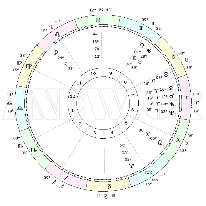| | ΘΕΣΕΙΣ ΠΛΑΝΗΤΩΝ ΑΣΤΡΟΛΟΓΙΚΟΥ ΧΑΡΤΗ ΤΗΣ ΣΤΙΓΜΗΣ ΑΥΤΗΣ | | | | Πλανήτης | Ζώδιο | Μοίρες | Δεκαήμ. | Σε οίκο | Απόκλιση | | Ακμές των οίκων | | Ηλιος | Ταύρος | 05°22' | Πρώτο | 8 | 13 N 18 | | 1ος | 21°03' | Παρθένος | | Σελήνη | Λέων | 23°36' | Τρίτο | 11 | 14 N 48 | | 2ος | 16°56' | Ζυγός | | Ερμής | Κριός | 16°16' | Δεύτερο | 7 | 04 N 11 | | 3ος | 16°60' | Σκορπιός | | Αφροδίτη | Δίδυμοι | 01°42' | Πρώτο | 9 | 21 N 08 | | 4ος | 19°55' | Τοξότης | | Αρης | Κριός | 12°12' | Δεύτερο | 7 | 03 N 58 | | 5ος | 23°05' | Αιγόκερως | | Δίας | Καρκίνος | 18°11' | Δεύτερο | 10 | 22 N 35 | | 6ος | 23°51' | Υδροχόος | | Κρόνος | Κριός | 08°38' | Πρώτο | 7 | 01 N 26 | | 7ος | 21°03' | Ιχθείς | | Ουρανός | Ταύρος | 29°59' | Τρίτο | 9 | 19 N 59 | | 8ος | 16°56' | Κριός | | Ποσειδώνας | Κριός | 03°05' | Πρώτο | 7 | 00 N 01 | | 9ος | 16°60' | Ταύρος | | Πλούτωνας | Υδροχόος | 05°29' | Πρώτο | 5 | 22 S 48 | | 10ος | 19°55' | Δίδυμοι | | Β. Δεσμός | Ιχθείς | 06°06' | Πρώτο | 6 | 09 S 16 | | 11ος | 23°05' | Καρκίνος | | Ωροσκόπος | Παρθένος | 21°03' | Τρίτο | | | 12ος | 23°51' | Λέων | | Μεσουράνημα | Δίδυμοι | 19°55' | Δεύτερο | | | |