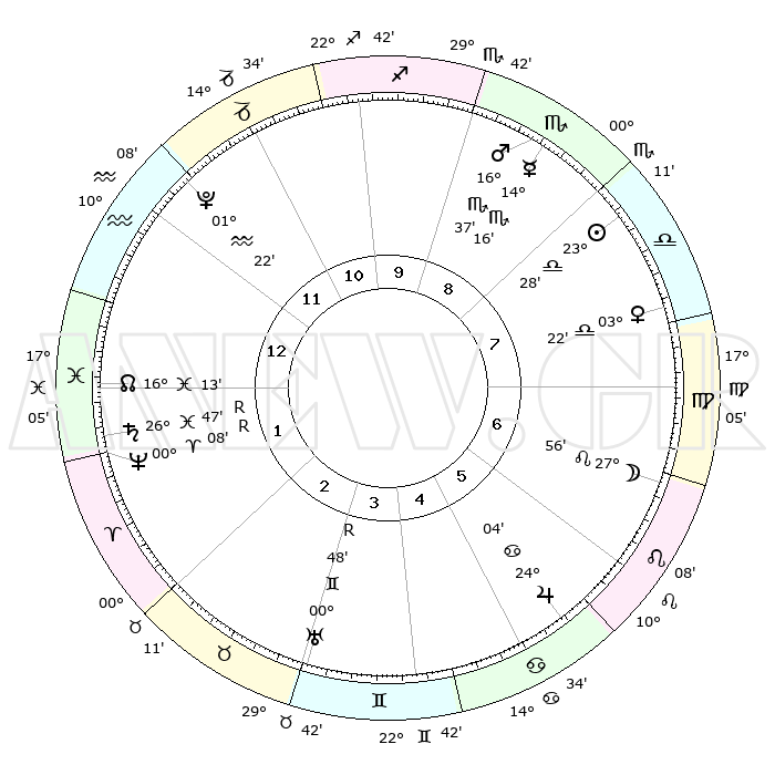 | ΘΕΣΕΙΣ ΠΛΑΝΗΤΩΝ ΑΣΤΡΟΛΟΓΙΚΟΥ ΧΑΡΤΗ ΤΗΣ ΣΤΙΓΜΗΣ ΑΥΤΗΣ | | Πλανήτης | Ζώδιο | Μοίρες | Δεκαήμ. | Σε οίκο | Απόκλιση | | Ακμές των οίκων | Ηλιος | Ζυγός | 23°17' | Τρίτο | 10 | 09 S 03 | | 1ος | 27°11' | Τοξότης | Σελήνη | Λέων | 25°37' | Τρίτο | 8 | 14 N 51 | | 2ος | 03°37' | Υδροχόος | Ερμής | Σκορπιός | 14°01' | Δεύτερο | 10 | 17 S 50 | | 3ος | 13°24' | Ιχθείς | Αφροδίτη | Ζυγός | 03°09' | Πρώτο | 9 | 00 N 09 | | 4ος | 17°46' | Κριός | Αρης | Σκορπιός | 16°29' | Δεύτερο | 11 | 16 S 59 | | 5ος | 14°32' | Ταύρος | Δίας | Καρκίνος | 24°03' | Τρίτο | 7 | 21 N 21 | | 6ος | 06°32' | Δίδυμοι | Κρόνος | Ιχθείς | 26°48'R | Τρίτο | 3 | 03 S 34 | | 7ος | 27°11' | Δίδυμοι | Ουρανός | Δίδυμοι | 00°49'R | Πρώτο | 5 | 20 N 07 | | 8ος | 03°37' | Λέων | Ποσειδώνας | Κριός | 00°08'R | Πρώτο | 3 | 01 S 12 | | 9ος | 13°24' | Παρθένος | Πλούτωνας | Υδροχόος | 01°22' | Πρώτο | 1 | 23 S 32 | | 10ος | 17°46' | Ζυγός | Β. Δεσμός | Ιχθείς | 16°14' | Δεύτερο | 3 | 05 S 26 | | 11ος | 14°32' | Σκορπιός | Ωροσκόπος | Τοξότης | 27°11' | Τρίτο | | | 12ος | 06°32' | Τοξότης | Μεσουράνημα | Ζυγός | 17°46' | Δεύτερο | | | |