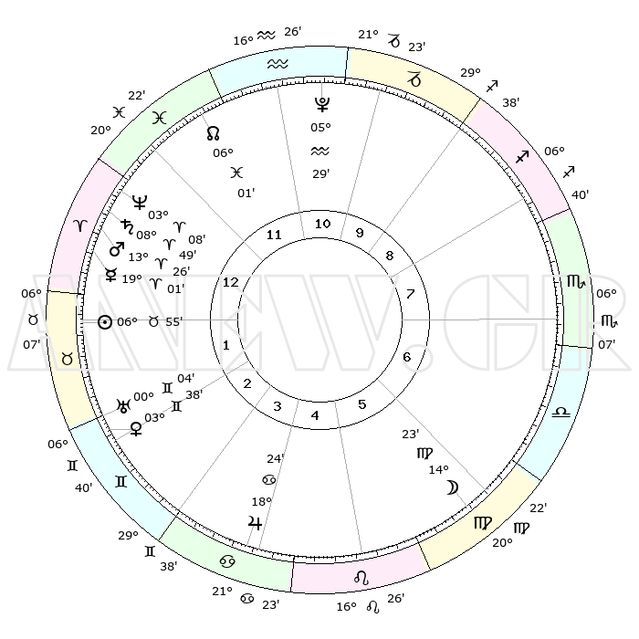 | | ΘΕΣΕΙΣ ΠΛΑΝΗΤΩΝ ΑΣΤΡΟΛΟΓΙΚΟΥ ΧΑΡΤΗ ΤΗΣ ΣΤΙΓΜΗΣ ΑΥΤΗΣ | | | | Πλανήτης | Ζώδιο | Μοίρες | Δεκαήμ. | Σε οίκο | Απόκλιση | | Ακμές των οίκων | | Ηλιος | Ταύρος | 06°51' | Πρώτο | 1 | 13 N 48 | | 1ος | 03°45' | Κριός | | Σελήνη | Παρθένος | 13°38' | Δεύτερο | 6 | 05 N 55 | | 2ος | 13°07' | Ταύρος | | Ερμής | Κριός | 18°55' | Δεύτερο | 1 | 05 N 17 | | 3ος | 09°58' | Δίδυμοι | | Αφροδίτη | Δίδυμοι | 03°34' | Πρώτο | 2 | 21 N 34 | | 4ος | 02°07' | Καρκίνος | | Αρης | Κριός | 13°23' | Δεύτερο | 1 | 04 N 26 | | 5ος | 24°35' | Καρκίνος | | Δίας | Καρκίνος | 18°23' | Δεύτερο | 4 | 22 N 33 | | 6ος | 22°35' | Λέων | | Κρόνος | Κριός | 08°49' | Πρώτο | 1 | 01 N 30 | | 7ος | 03°45' | Ζυγός | | Ουρανός | Δίδυμοι | 00°04' | Πρώτο | 2 | 20 N 00 | | 8ος | 13°07' | Σκορπιός | | Ποσειδώνας | Κριός | 03°08' | Πρώτο | 12 | 00 N 02 | | 9ος | 09°58' | Τοξότης | | Πλούτωνας | Υδροχόος | 05°29' | Πρώτο | 11 | 22 S 48 | | 10ος | 02°07' | Αιγόκερως | | Β. Δεσμός | Ιχθείς | 06°01' | Πρώτο | 12 | 09 S 18 | | 11ος | 24°35' | Αιγόκερως | | Ωροσκόπος | Κριός | 03°45' | Πρώτο | | | 12ος | 22°35' | Υδροχόος | | Μεσουράνημα | Αιγόκερως | 02°07' | Πρώτο | | | |