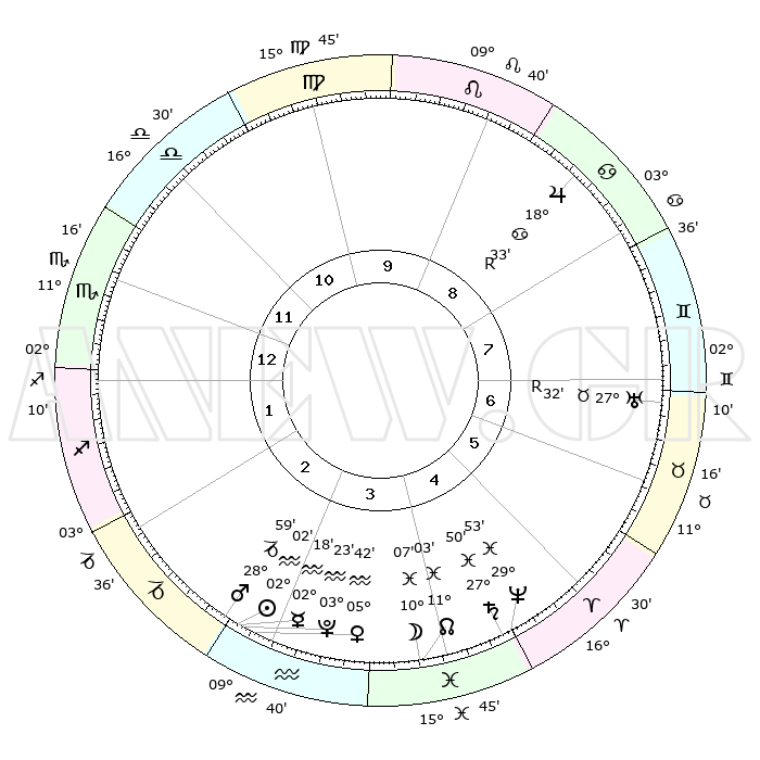 | | ΘΕΣΕΙΣ ΠΛΑΝΗΤΩΝ ΑΣΤΡΟΛΟΓΙΚΟΥ ΧΑΡΤΗ ΤΗΣ ΣΤΙΓΜΗΣ ΑΥΤΗΣ | | | | Πλανήτης | Ζώδιο | Μοίρες | Δεκαήμ. | Σε οίκο | Απόκλιση | | Ακμές των οίκων | | Ηλιος | Υδροχόος | 01°57' | Πρώτο | 3 | 19 S 43 | | 1ος | 10°11' | Σκορπιός | | Σελήνη | Ιχθείς | 09°08' | Πρώτο | 4 | 08 S 10 | | 2ος | 09°16' | Τοξότης | | Ερμής | Υδροχόος | 02°11' | Πρώτο | 3 | 21 S 41 | | 3ος | 12°11' | Αιγόκερως | | Αφροδίτη | Υδροχόος | 05°37' | Πρώτο | 3 | 20 S 00 | | 4ος | 17°06' | Υδροχόος | | Αρης | Αιγόκερως | 28°55' | Τρίτο | 3 | 21 S 21 | | 5ος | 19°46' | Ιχθείς | | Δίας | Καρκίνος | 18°34'R | Δεύτερο | 9 | 22 N 26 | | 6ος | 17°23' | Κριός | | Κρόνος | Ιχθείς | 27°49' | Τρίτο | 5 | 02 S 53 | | 7ος | 10°11' | Ταύρος | | Ουρανός | Ταύρος | 27°32'R | Τρίτο | 7 | 19 N 25 | | 8ος | 09°16' | Δίδυμοι | | Ποσειδώνας | Ιχθείς | 29°53' | Τρίτο | 5 | 01 S 15 | | 9ος | 12°11' | Καρκίνος | | Πλούτωνας | Υδροχόος | 03°23' | Πρώτο | 3 | 23 S 05 | | 10ος | 17°06' | Λέων | | Β. Δεσμός | Ιχθείς | 11°03' | Δεύτερο | 4 | 07 S 25 | | 11ος | 19°46' | Παρθένος | | Ωροσκόπος | Σκορπιός | 10°11' | Δεύτερο | | | 12ος | 17°23' | Ζυγός | | Μεσουράνημα | Λέων | 17°06' | Δεύτερο | | | |