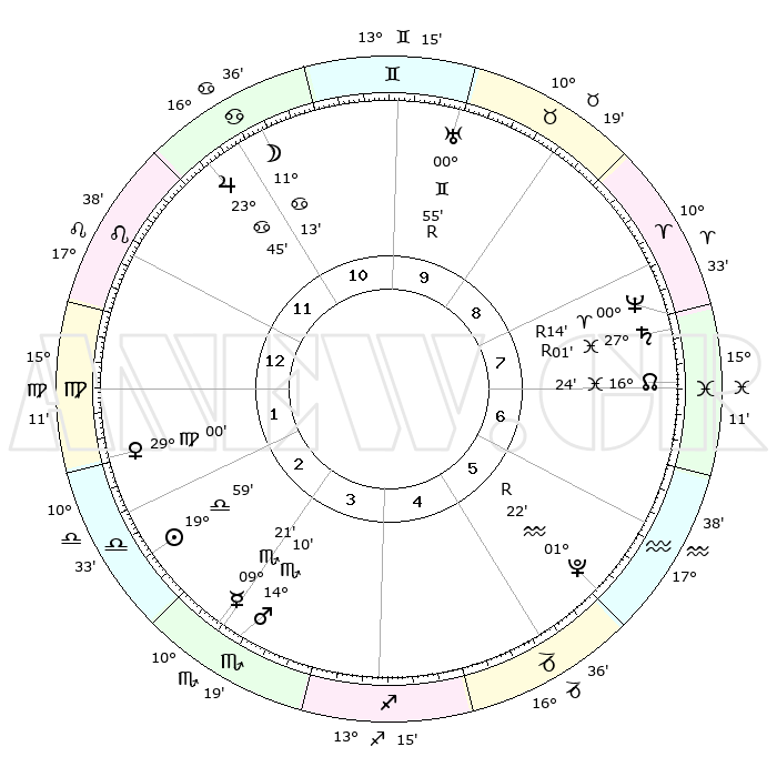 | ΘΕΣΕΙΣ ΠΛΑΝΗΤΩΝ ΑΣΤΡΟΛΟΓΙΚΟΥ ΧΑΡΤΗ ΤΗΣ ΣΤΙΓΜΗΣ ΑΥΤΗΣ | | Πλανήτης | Ζώδιο | Μοίρες | Δεκαήμ. | Σε οίκο | Απόκλιση | | Ακμές των οίκων | Ηλιος | Ζυγός | 19°53' | Δεύτερο | 3 | 07 S 46 | | 1ος | 14°15' | Λέων | Σελήνη | Καρκίνος | 09°44' | Πρώτο | 11 | 27 N 54 | | 2ος | 06°28' | Παρθένος | Ερμής | Σκορπιός | 09°12' | Πρώτο | 4 | 15 S 59 | | 3ος | 03°25' | Ζυγός | Αφροδίτη | Παρθένος | 28°52' | Τρίτο | 2 | 01 N 49 | | 4ος | 05°48' | Σκορπιός | Αρης | Σκορπιός | 14°06' | Δεύτερο | 4 | 16 S 16 | | 5ος | 11°07' | Τοξότης | Δίας | Καρκίνος | 23°45' | Τρίτο | 12 | 21 N 23 | | 6ος | 14°42' | Αιγόκερως | Κρόνος | Ιχθείς | 27°01'R | Τρίτο | 8 | 03 S 29 | | 7ος | 14°15' | Υδροχόος | Ουρανός | Δίδυμοι | 00°55'R | Πρώτο | 10 | 20 N 08 | | 8ος | 06°28' | Ιχθείς | Ποσειδώνας | Κριός | 00°14'R | Πρώτο | 8 | 01 S 10 | | 9ος | 03°25' | Κριός | Πλούτωνας | Υδροχόος | 01°22'R | Πρώτο | 6 | 23 S 32 | | 10ος | 05°48' | Ταύρος | Β. Δεσμός | Ιχθείς | 16°24' | Δεύτερο | 8 | 05 S 22 | | 11ος | 11°07' | Δίδυμοι | Ωροσκόπος | Λέων | 14°15' | Δεύτερο | | | 12ος | 14°42' | Καρκίνος | Μεσουράνημα | Ταύρος | 05°48' | Πρώτο | | | |