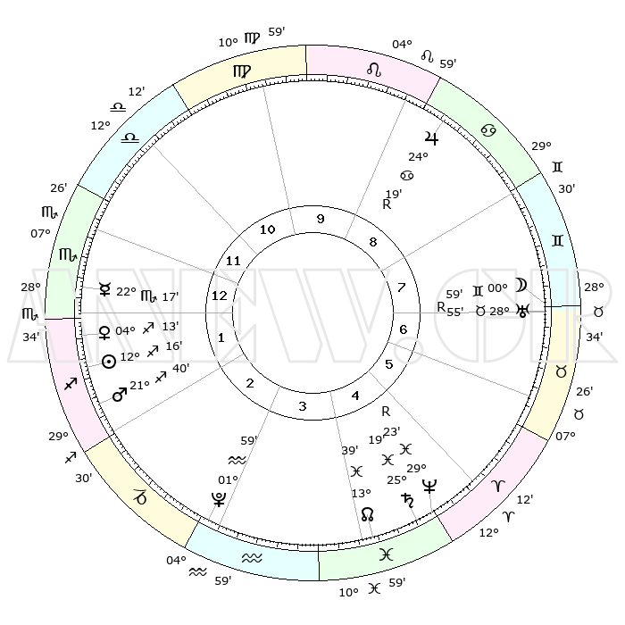 | | ΘΕΣΕΙΣ ΠΛΑΝΗΤΩΝ ΑΣΤΡΟΛΟΓΙΚΟΥ ΧΑΡΤΗ ΤΗΣ ΣΤΙΓΜΗΣ ΑΥΤΗΣ | | | | Πλανήτης | Ζώδιο | Μοίρες | Δεκαήμ. | Σε οίκο | Απόκλιση | | Ακμές των οίκων | | Ηλιος | Τοξότης | 12°14' | Δεύτερο | 1 | 22 S 15 | | 1ος | 18°05' | Σκορπιός | | Σελήνη | Δίδυμοι | 00°26' | Πρώτο | 7 | 24 N 59 | | 2ος | 17°50' | Τοξότης | | Ερμής | Σκορπιός | 22°16' | Τρίτο | 1 | 15 S 50 | | 3ος | 21°44' | Αιγόκερως | | Αφροδίτη | Τοξότης | 04°10' | Πρώτο | 1 | 20 S 24 | | 4ος | 27°13' | Υδροχόος | | Αρης | Τοξότης | 21°39' | Τρίτο | 2 | 23 S 51 | | 5ος | 29°26' | Ιχθείς | | Δίας | Καρκίνος | 24°19'R | Τρίτο | 9 | 21 N 25 | | 6ος | 26°05' | Κριός | | Κρόνος | Ιχθείς | 25°19' | Τρίτο | 4 | 04 S 02 | | 7ος | 18°05' | Ταύρος | | Ουρανός | Ταύρος | 28°55'R | Τρίτο | 7 | 19 N 43 | | 8ος | 17°50' | Δίδυμοι | | Ποσειδώνας | Ιχθείς | 29°23'R | Τρίτο | 4 | 01 S 29 | | 9ος | 21°44' | Καρκίνος | | Πλούτωνας | Υδροχόος | 01°59' | Πρώτο | 3 | 23 S 23 | | 10ος | 27°13' | Λέων | | Β. Δεσμός | Ιχθείς | 13°39' | Δεύτερο | 4 | 06 S 26 | | 11ος | 29°26' | Παρθένος | | Ωροσκόπος | Σκορπιός | 18°05' | Δεύτερο | | | 12ος | 26°05' | Ζυγός | | Μεσουράνημα | Λέων | 27°13' | Τρίτο | | | |