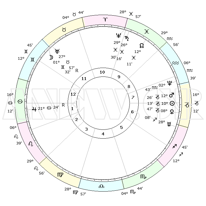 | | ΘΕΣΕΙΣ ΠΛΑΝΗΤΩΝ ΑΣΤΡΟΛΟΓΙΚΟΥ ΧΑΡΤΗ ΤΗΣ ΣΤΙΓΜΗΣ ΑΥΤΗΣ | | | | Πλανήτης | Ζώδιο | Μοίρες | Δεκαήμ. | Σε οίκο | Απόκλιση | | Ακμές των οίκων | | Ηλιος | Αιγόκερως | 10°08' | Δεύτερο | 7 | 23 S 03 | | 1ος | 20°56' | Δίδυμοι | | Σελήνη | Δίδυμοι | 00°23' | Πρώτο | 12 | 25 N 05 | | 2ος | 12°29' | Καρκίνος | | Ερμής | Τοξότης | 28°01' | Τρίτο | 7 | 23 S 56 | | 3ος | 03°51' | Λέων | | Αφροδίτη | Αιγόκερως | 08°41' | Πρώτο | 7 | 23 S 38 | | 4ος | 28°49' | Λέων | | Αρης | Αιγόκερως | 12°22' | Δεύτερο | 7 | 23 S 45 | | 5ος | 01°10' | Ζυγός | | Δίας | Καρκίνος | 21°24'R | Τρίτο | 2 | 21 N 58 | | 6ος | 11°28' | Σκορπιός | | Κρόνος | Ιχθείς | 26°16' | Τρίτο | 10 | 03 S 34 | | 7ος | 20°56' | Τοξότης | | Ουρανός | Ταύρος | 27°57'R | Τρίτο | 12 | 19 N 30 | | 8ος | 12°29' | Αιγόκερως | | Ποσειδώνας | Ιχθείς | 29°30' | Τρίτο | 10 | 01 S 25 | | 9ος | 03°51' | Υδροχόος | | Πλούτωνας | Υδροχόος | 02°43' | Πρώτο | 8 | 23 S 13 | | 10ος | 28°49' | Υδροχόος | | Β. Δεσμός | Ιχθείς | 12°12' | Δεύτερο | 10 | 06 S 59 | | 11ος | 01°10' | Κριός | | Ωροσκόπος | Δίδυμοι | 20°56' | Τρίτο | | | 12ος | 11°28' | Ταύρος | | Μεσουράνημα | Υδροχόος | 28°49' | Τρίτο | | | |