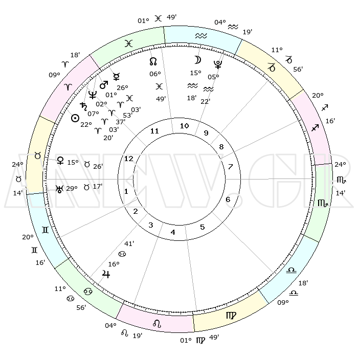 | | ΘΕΣΕΙΣ ΠΛΑΝΗΤΩΝ ΑΣΤΡΟΛΟΓΙΚΟΥ ΧΑΡΤΗ ΤΗΣ ΣΤΙΓΜΗΣ ΑΥΤΗΣ | | | | Πλανήτης | Ζώδιο | Μοίρες | Δεκαήμ. | Σε οίκο | Απόκλιση | | Ακμές των οίκων | | Ηλιος | Κριός | 22°16' | Τρίτο | 1 | 08 N 40 | | 1ος | 20°17' | Κριός | | Σελήνη | Υδροχόος | 14°28' | Δεύτερο | 11 | 18 S 28 | | 2ος | 25°12' | Ταύρος | | Ερμής | Ιχθείς | 25°58' | Τρίτο | 12 | 03 S 53 | | 3ος | 19°51' | Δίδυμοι | | Αφροδίτη | Ταύρος | 15°21' | Δεύτερο | 1 | 16 N 29 | | 4ος | 11°34' | Καρκίνος | | Αρης | Κριός | 01°50' | Πρώτο | 12 | 00 S 11 | | 5ος | 05°07' | Λέων | | Δίας | Καρκίνος | 16°41' | Δεύτερο | 4 | 22 N 46 | | 6ος | 05°58' | Παρθένος | | Κρόνος | Κριός | 07°02' | Πρώτο | 12 | 00 N 50 | | 7ος | 20°17' | Ζυγός | | Ουρανός | Ταύρος | 29°17' | Τρίτο | 2 | 19 N 50 | | 8ος | 25°12' | Σκορπιός | | Ποσειδώνας | Κριός | 02°37' | Πρώτο | 12 | 00 S 10 | | 9ος | 19°51' | Τοξότης | | Πλούτωνας | Υδροχόος | 05°22' | Πρώτο | 11 | 22 S 47 | | 10ος | 11°34' | Αιγόκερως | | Β. Δεσμός | Ιχθείς | 06°49' | Πρώτο | 12 | 09 S 00 | | 11ος | 05°07' | Υδροχόος | | Ωροσκόπος | Κριός | 20°17' | Τρίτο | | | 12ος | 05°58' | Ιχθείς | | Μεσουράνημα | Αιγόκερως | 11°34' | Δεύτερο | | | |