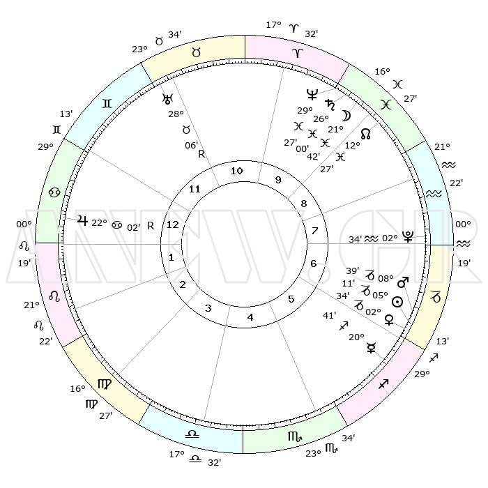 | | ΘΕΣΕΙΣ ΠΛΑΝΗΤΩΝ ΑΣΤΡΟΛΟΓΙΚΟΥ ΧΑΡΤΗ ΤΗΣ ΣΤΙΓΜΗΣ ΑΥΤΗΣ | | | | Πλανήτης | Ζώδιο | Μοίρες | Δεκαήμ. | Σε οίκο | Απόκλιση | | Ακμές των οίκων | | Ηλιος | Αιγόκερως | 05°06' | Πρώτο | 6 | 23 S 20 | | 1ος | 07°54' | Καρκίνος | | Σελήνη | Ιχθείς | 20°43' | Τρίτο | 10 | 02 S 55 | | 2ος | 28°22' | Καρκίνος | | Ερμής | Τοξότης | 20°34' | Τρίτο | 6 | 23 S 03 | | 3ος | 20°47' | Λέων | | Αφροδίτη | Αιγόκερως | 02°28' | Πρώτο | 6 | 23 S 43 | | 4ος | 18°24' | Παρθένος | | Αρης | Αιγόκερως | 08°36' | Πρώτο | 7 | 24 S 00 | | 5ος | 23°27' | Ζυγός | | Δίας | Καρκίνος | 22°02'R | Τρίτο | 1 | 21 N 51 | | 6ος | 02°40' | Τοξότης | | Κρόνος | Ιχθείς | 25°60' | Τρίτο | 10 | 03 S 41 | | 7ος | 07°54' | Αιγόκερως | | Ουρανός | Ταύρος | 28°06'R | Τρίτο | 11 | 19 N 32 | | 8ος | 28°22' | Αιγόκερως | | Ποσειδώνας | Ιχθείς | 29°27' | Τρίτο | 10 | 01 S 27 | | 9ος | 20°47' | Υδροχόος | | Πλούτωνας | Υδροχόος | 02°34' | Πρώτο | 8 | 23 S 15 | | 10ος | 18°24' | Ιχθείς | | Β. Δεσμός | Ιχθείς | 12°27' | Δεύτερο | 9 | 06 S 53 | | 11ος | 23°27' | Κριός | | Ωροσκόπος | Καρκίνος | 07°54' | Πρώτο | | | 12ος | 02°40' | Δίδυμοι | | Μεσουράνημα | Ιχθείς | 18°24' | Δεύτερο | | | |
