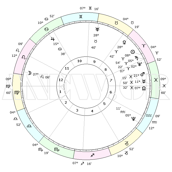 | | ΘΕΣΕΙΣ ΠΛΑΝΗΤΩΝ ΑΣΤΡΟΛΟΓΙΚΟΥ ΧΑΡΤΗ ΤΗΣ ΣΤΙΓΜΗΣ ΑΥΤΗΣ | | | | Πλανήτης | Ζώδιο | Μοίρες | Δεκαήμ. | Σε οίκο | Απόκλιση | | Ακμές των οίκων | | Ηλιος | Κριός | 08°51' | Πρώτο | 8 | 03 N 30 | | 1ος | 21°35' | Λέων | | Σελήνη | Λέων | 26°15' | Τρίτο | 1 | 13 N 50 | | 2ος | 14°34' | Παρθένος | | Ερμής | Ιχθείς | 11°47' | Δεύτερο | 7 | 07 S 58 | | 3ος | 12°23' | Ζυγός | | Αφροδίτη | Κριός | 28°37' | Τρίτο | 9 | 10 N 28 | | 4ος | 15°07' | Σκορπιός | | Αρης | Ιχθείς | 21°12' | Τρίτο | 8 | 04 S 27 | | 5ος | 19°54' | Τοξότης | | Δίας | Καρκίνος | 15°38' | Δεύτερο | 11 | 22 N 53 | | 6ος | 22°38' | Αιγόκερως | | Κρόνος | Κριός | 05°21' | Πρώτο | 8 | 00 N 10 | | 7ος | 21°35' | Υδροχόος | | Ουρανός | Ταύρος | 28°39' | Τρίτο | 10 | 19 N 41 | | 8ος | 14°34' | Ιχθείς | | Ποσειδώνας | Κριός | 02°07' | Πρώτο | 8 | 00 S 21 | | 9ος | 12°23' | Κριός | | Πλούτωνας | Υδροχόος | 05°11' | Πρώτο | 6 | 22 S 48 | | 10ος | 15°07' | Ταύρος | | Β. Δεσμός | Ιχθείς | 07°32' | Πρώτο | 7 | 08 S 44 | | 11ος | 19°54' | Δίδυμοι | | Ωροσκόπος | Λέων | 21°35' | Τρίτο | | | 12ος | 22°38' | Καρκίνος | | Μεσουράνημα | Ταύρος | 15°07' | Δεύτερο | | | |