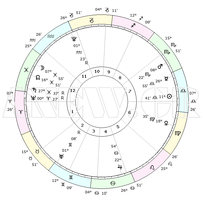 | ΘΕΣΕΙΣ ΠΛΑΝΗΤΩΝ ΑΣΤΡΟΛΟΓΙΚΟΥ ΧΑΡΤΗ ΤΗΣ ΣΤΙΓΜΗΣ ΑΥΤΗΣ | | Πλανήτης | Ζώδιο | Μοίρες | Δεκαήμ. | Σε οίκο | Απόκλιση | | Ακμές των οίκων | Ηλιος | Ζυγός | 11°33' | Δεύτερο | 8 | 04 S 34 | | 1ος | 01°54' | Υδροχόος | Σελήνη | Ιχθείς | 06°12' | Πρώτο | 1 | 10 S 16 | | 2ος | 16°18' | Ιχθείς | Ερμής | Ζυγός | 26°43' | Τρίτο | 9 | 10 S 48 | | 3ος | 24°27' | Κριός | Αφροδίτη | Παρθένος | 18°26' | Δεύτερο | 8 | 05 N 50 | | 4ος | 22°35' | Ταύρος | Αρης | Σκορπιός | 08°17' | Πρώτο | 9 | 14 S 22 | | 5ος | 15°13' | Δίδυμοι | Δίας | Καρκίνος | 22°53' | Τρίτο | 6 | 21 N 31 | | 6ος | 06°42' | Καρκίνος | Κρόνος | Ιχθείς | 27°37'R | Τρίτο | 2 | 03 S 15 | | 7ος | 01°54' | Λέων | Ουρανός | Δίδυμοι | 01°08'R | Πρώτο | 4 | 20 N 10 | | 8ος | 16°18' | Παρθένος | Ποσειδώνας | Κριός | 00°27'R | Πρώτο | 2 | 01 S 05 | | 9ος | 24°27' | Ζυγός | Πλούτωνας | Υδροχόος | 01°23'R | Πρώτο | 12 | 23 S 32 | | 10ος | 22°35' | Σκορπιός | Β. Δεσμός | Ιχθείς | 16°51' | Δεύτερο | 2 | 05 S 11 | | 11ος | 15°13' | Τοξότης | Ωροσκόπος | Υδροχόος | 01°54' | Πρώτο | | | 12ος | 06°42' | Αιγόκερως | Μεσουράνημα | Σκορπιός | 22°35' | Τρίτο | | | |