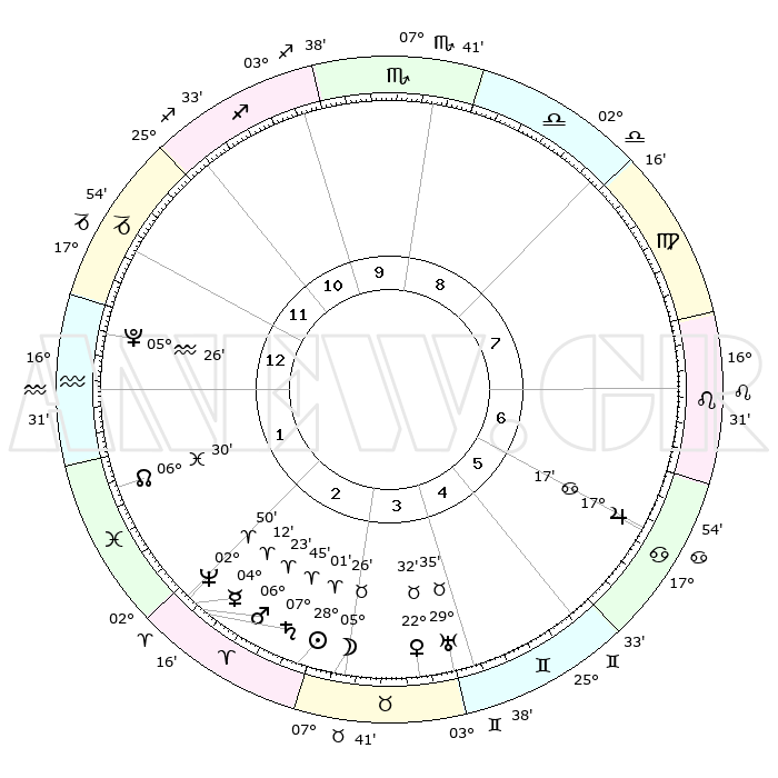 | | ΘΕΣΕΙΣ ΠΛΑΝΗΤΩΝ ΑΣΤΡΟΛΟΓΙΚΟΥ ΧΑΡΤΗ ΤΗΣ ΣΤΙΓΜΗΣ ΑΥΤΗΣ | | | | Πλανήτης | Ζώδιο | Μοίρες | Δεκαήμ. | Σε οίκο | Απόκλιση | | Ακμές των οίκων | | Ηλιος | Κριός | 27°57' | Τρίτο | 3 | 10 N 45 | | 1ος | 18°46' | Αιγόκερως | | Σελήνη | Ταύρος | 04°30' | Πρώτο | 3 | 17 N 02 | | 2ος | 00°38' | Ιχθείς | | Ερμής | Κριός | 04°06' | Πρώτο | 2 | 00 S 47 | | 3ος | 10°28' | Κριός | | Αφροδίτη | Ταύρος | 22°27' | Τρίτο | 4 | 18 N 41 | | 4ος | 10°59' | Ταύρος | | Αρης | Κριός | 06°20' | Πρώτο | 2 | 01 N 38 | | 5ος | 04°45' | Δίδυμοι | | Δίας | Καρκίνος | 17°17' | Δεύτερο | 6 | 22 N 42 | | 6ος | 25°58' | Δίδυμοι | | Κρόνος | Κριός | 07°45' | Πρώτο | 2 | 01 N 06 | | 7ος | 18°46' | Καρκίνος | | Ουρανός | Ταύρος | 29°35' | Τρίτο | 4 | 19 N 53 | | 8ος | 00°38' | Παρθένος | | Ποσειδώνας | Κριός | 02°50' | Πρώτο | 2 | 00 S 05 | | 9ος | 10°28' | Ζυγός | | Πλούτωνας | Υδροχόος | 05°26' | Πρώτο | 1 | 22 S 47 | | 10ος | 10°59' | Σκορπιός | | Β. Δεσμός | Ιχθείς | 06°30' | Πρώτο | 2 | 09 S 07 | | 11ος | 04°45' | Τοξότης | | Ωροσκόπος | Αιγόκερως | 18°46' | Δεύτερο | | | 12ος | 25°58' | Τοξότης | | Μεσουράνημα | Σκορπιός | 10°59' | Δεύτερο | | | |