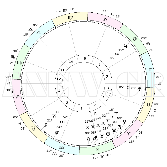 | | ΘΕΣΕΙΣ ΠΛΑΝΗΤΩΝ ΑΣΤΡΟΛΟΓΙΚΟΥ ΧΑΡΤΗ ΤΗΣ ΣΤΙΓΜΗΣ ΑΥΤΗΣ | | | | Πλανήτης | Ζώδιο | Μοίρες | Δεκαήμ. | Σε οίκο | Απόκλιση | | Ακμές των οίκων | | Ηλιος | Ιχθείς | 23°17' | Τρίτο | 4 | 02 S 40 | | 1ος | 13°30' | Σκορπιός | | Σελήνη | Αιγόκερως | 20°23' | Τρίτο | 3 | 25 S 48 | | 2ος | 12°51' | Τοξότης | | Ερμής | Ιχθείς | 10°59'R | Δεύτερο | 4 | 04 S 58 | | 3ος | 16°09' | Αιγόκερως | | Αφροδίτη | Κριός | 09°13' | Πρώτο | 5 | 02 N 40 | | 4ος | 21°19' | Υδροχόος | | Αρης | Ιχθείς | 08°53' | Πρώτο | 4 | 09 S 15 | | 5ος | 23°49' | Ιχθείς | | Δίας | Καρκίνος | 15°06' | Δεύτερο | 8 | 22 N 56 | | 6ος | 21°03' | Κριός | | Κρόνος | Κριός | 03°24' | Πρώτο | 5 | 00 S 36 | | 7ος | 13°30' | Ταύρος | | Ουρανός | Ταύρος | 28°05' | Τρίτο | 7 | 19 N 33 | | 8ος | 12°51' | Δίδυμοι | | Ποσειδώνας | Κριός | 01°31' | Πρώτο | 5 | 00 S 36 | | 9ος | 16°09' | Καρκίνος | | Πλούτωνας | Υδροχόος | 04°52' | Πρώτο | 3 | 22 S 50 | | 10ος | 21°19' | Λέων | | Β. Δεσμός | Ιχθείς | 08°22' | Πρώτο | 4 | 08 S 26 | | 11ος | 23°49' | Παρθένος | | Ωροσκόπος | Σκορπιός | 13°30' | Δεύτερο | | | 12ος | 21°03' | Ζυγός | | Μεσουράνημα | Λέων | 21°19' | Τρίτο | | | |