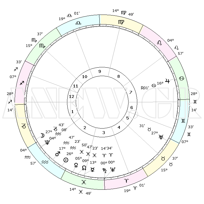| | ΘΕΣΕΙΣ ΠΛΑΝΗΤΩΝ ΑΣΤΡΟΛΟΓΙΚΟΥ ΧΑΡΤΗ ΤΗΣ ΣΤΙΓΜΗΣ ΑΥΤΗΣ | | | | Πλανήτης | Ζώδιο | Μοίρες | Δεκαήμ. | Σε οίκο | Απόκλιση | | Ακμές των οίκων | | Ηλιος | Υδροχόος | 26°19' | Τρίτο | 3 | 12 S 44 | | 1ος | 08°24' | Τοξότης | | Σελήνη | Αιγόκερως | 26°55' | Τρίτο | 2 | 24 S 14 | | 2ος | 10°50' | Αιγόκερως | | Ερμής | Ιχθείς | 13°18' | Δεύτερο | 3 | 06 S 31 | | 3ος | 17°58' | Υδροχόος | | Αφροδίτη | Ιχθείς | 05°45' | Πρώτο | 3 | 10 S 46 | | 4ος | 24°00' | Ιχθείς | | Αρης | Υδροχόος | 17°44' | Δεύτερο | 2 | 16 S 32 | | 5ος | 23°52' | Κριός | | Δίας | Καρκίνος | 16°01'R | Δεύτερο | 8 | 22 N 48 | | 6ος | 17°48' | Ταύρος | | Κρόνος | Κριός | 00°14' | Πρώτο | 4 | 01 S 53 | | 7ος | 08°24' | Δίδυμοι | | Ουρανός | Ταύρος | 27°31' | Τρίτο | 6 | 19 N 25 | | 8ος | 10°50' | Καρκίνος | | Ποσειδώνας | Κριός | 00°34' | Πρώτο | 4 | 00 S 59 | | 9ος | 17°58' | Λέων | | Πλούτωνας | Υδροχόος | 04°08' | Πρώτο | 2 | 22 S 57 | | 10ος | 24°00' | Παρθένος | | Β. Δεσμός | Ιχθείς | 09°47' | Πρώτο | 3 | 07 S 54 | | 11ος | 23°52' | Ζυγός | | Ωροσκόπος | Τοξότης | 08°24' | Πρώτο | | | 12ος | 17°48' | Σκορπιός | | Μεσουράνημα | Παρθένος | 24°00' | Τρίτο | | | |
