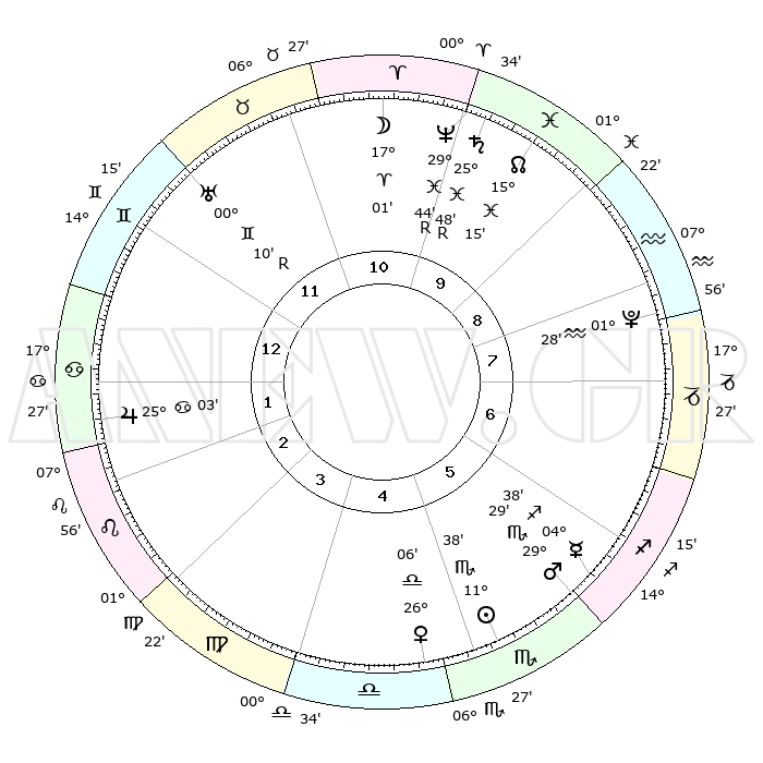 | | ΘΕΣΕΙΣ ΠΛΑΝΗΤΩΝ ΑΣΤΡΟΛΟΓΙΚΟΥ ΧΑΡΤΗ ΤΗΣ ΣΤΙΓΜΗΣ ΑΥΤΗΣ | | | | Πλανήτης | Ζώδιο | Μοίρες | Δεκαήμ. | Σε οίκο | Απόκλιση | | Ακμές των οίκων | | Ηλιος | Σκορπιός | 11°20' | Δεύτερο | 8 | 15 S 14 | | 1ος | 01°44' | Ιχθείς | | Σελήνη | Κριός | 12°34' | Δεύτερο | 1 | 07 N 00 | | 2ος | 17°00' | Κριός | | Ερμής | Τοξότης | 04°26' | Πρώτο | 9 | 23 S 51 | | 3ος | 19°23' | Ταύρος | | Αφροδίτη | Ζυγός | 25°43' | Τρίτο | 8 | 08 S 36 | | 4ος | 13°37' | Δίδυμοι | | Αρης | Σκορπιός | 29°17' | Τρίτο | 9 | 20 S 24 | | 5ος | 05°18' | Καρκίνος | | Δίας | Καρκίνος | 25°03' | Τρίτο | 5 | 21 N 12 | | 6ος | 29°02' | Καρκίνος | | Κρόνος | Ιχθείς | 25°49'R | Τρίτο | 1 | 03 S 55 | | 7ος | 01°44' | Παρθένος | | Ουρανός | Δίδυμοι | 00°11'R | Πρώτο | 3 | 19 N 59 | | 8ος | 17°00' | Ζυγός | | Ποσειδώνας | Ιχθείς | 29°44'R | Τρίτο | 1 | 01 S 21 | | 9ος | 19°23' | Σκορπιός | | Πλούτωνας | Υδροχόος | 01°28' | Πρώτο | 12 | 23 S 30 | | 10ος | 13°37' | Τοξότης | | Β. Δεσμός | Ιχθείς | 15°16' | Δεύτερο | 1 | 05 S 48 | | 11ος | 05°18' | Αιγόκερως | | Ωροσκόπος | Ιχθείς | 01°44' | Πρώτο | | | 12ος | 29°02' | Αιγόκερως | | Μεσουράνημα | Τοξότης | 13°37' | Δεύτερο | | | |