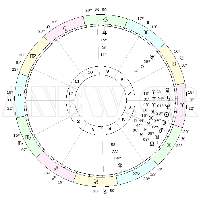 | | ΘΕΣΕΙΣ ΠΛΑΝΗΤΩΝ ΑΣΤΡΟΛΟΓΙΚΟΥ ΧΑΡΤΗ ΤΗΣ ΣΤΙΓΜΗΣ ΑΥΤΗΣ | | | | Πλανήτης | Ζώδιο | Μοίρες | Δεκαήμ. | Σε οίκο | Απόκλιση | | Ακμές των οίκων | | Ηλιος | Ιχθείς | 28°06' | Τρίτο | 6 | 00 S 45 | | 1ος | 00°35' | Ζυγός | | Σελήνη | Ιχθείς | 23°26' | Τρίτο | 6 | 01 S 24 | | 2ος | 27°13' | Ζυγός | | Ερμής | Ιχθείς | 08°43'R | Πρώτο | 6 | 06 S 54 | | 3ος | 27°40' | Σκορπιός | | Αφροδίτη | Κριός | 15°13' | Δεύτερο | 7 | 05 N 08 | | 4ος | 00°39' | Αιγόκερως | | Αρης | Ιχθείς | 12°41' | Δεύτερο | 6 | 07 S 48 | | 5ος | 03°38' | Υδροχόος | | Δίας | Καρκίνος | 15°11' | Δεύτερο | 10 | 22 N 56 | | 6ος | 04°02' | Ιχθείς | | Κρόνος | Κριός | 04°00' | Πρώτο | 7 | 00 S 22 | | 7ος | 00°35' | Κριός | | Ουρανός | Ταύρος | 28°14' | Τρίτο | 9 | 19 N 36 | | 8ος | 27°13' | Κριός | | Ποσειδώνας | Κριός | 01°42' | Πρώτο | 7 | 00 S 31 | | 9ος | 27°40' | Ταύρος | | Πλούτωνας | Υδροχόος | 04°58' | Πρώτο | 5 | 22 S 49 | | 10ος | 00°39' | Καρκίνος | | Β. Δεσμός | Ιχθείς | 08°06' | Πρώτο | 6 | 08 S 32 | | 11ος | 03°38' | Λέων | | Ωροσκόπος | Ζυγός | 00°35' | Πρώτο | | | 12ος | 04°02' | Παρθένος | | Μεσουράνημα | Καρκίνος | 00°39' | Πρώτο | | | |