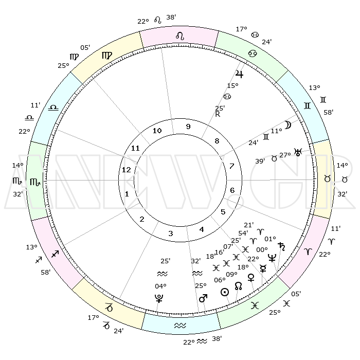 | | ΘΕΣΕΙΣ ΠΛΑΝΗΤΩΝ ΑΣΤΡΟΛΟΓΙΚΟΥ ΧΑΡΤΗ ΤΗΣ ΣΤΙΓΜΗΣ ΑΥΤΗΣ | | | | Πλανήτης | Ζώδιο | Μοίρες | Δεκαήμ. | Σε οίκο | Απόκλιση | | Ακμές των οίκων | | Ηλιος | Ιχθείς | 06°15' | Πρώτο | 5 | 09 S 13 | | 1ος | 28°49' | Ζυγός | | Σελήνη | Δίδυμοι | 10°38' | Δεύτερο | 8 | 27 N 15 | | 2ος | 27°10' | Σκορπιός | | Ερμής | Ιχθείς | 22°24' | Τρίτο | 5 | 00 S 45 | | 3ος | 29°02' | Τοξότης | | Αφροδίτη | Ιχθείς | 18°03' | Δεύτερο | 5 | 06 S 01 | | 4ος | 03°09' | Υδροχόος | | Αρης | Υδροχόος | 25°29' | Τρίτο | 4 | 14 S 03 | | 5ος | 06°04' | Ιχθείς | | Δίας | Καρκίνος | 15°25'R | Δεύτερο | 9 | 22 N 53 | | 6ος | 04°51' | Κριός | | Κρόνος | Κριός | 01°21' | Πρώτο | 5 | 01 S 25 | | 7ος | 28°50' | Κριός | | Ουρανός | Ταύρος | 27°39' | Τρίτο | 8 | 19 N 27 | | 8ος | 27°10' | Ταύρος | | Ποσειδώνας | Κριός | 00°54' | Πρώτο | 5 | 00 S 50 | | 9ος | 29°02' | Δίδυμοι | | Πλούτωνας | Υδροχόος | 04°25' | Πρώτο | 4 | 22 S 54 | | 10ος | 03°09' | Λέων | | Β. Δεσμός | Ιχθείς | 09°16' | Πρώτο | 5 | 08 S 06 | | 11ος | 06°04' | Παρθένος | | Ωροσκόπος | Ζυγός | 28°49' | Τρίτο | | | 12ος | 04°51' | Ζυγός | | Μεσουράνημα | Λέων | 03°09' | Πρώτο | | | |