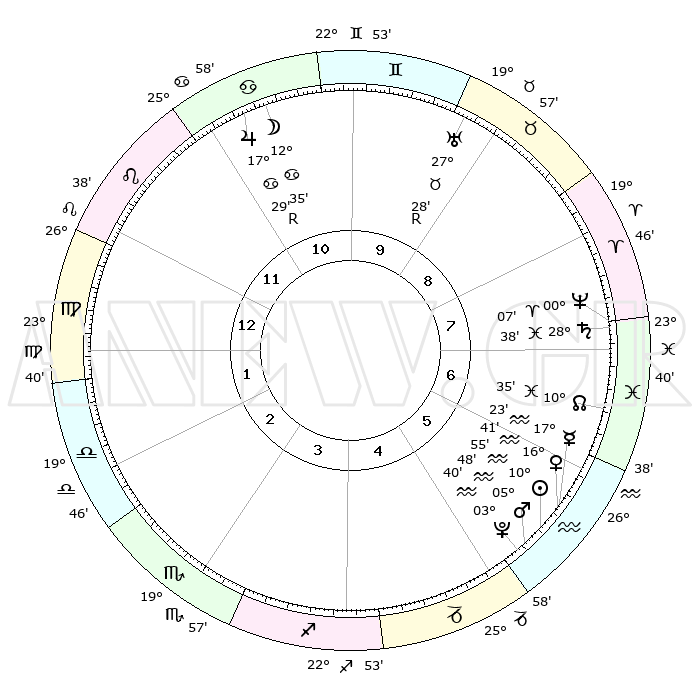 | | ΘΕΣΕΙΣ ΠΛΑΝΗΤΩΝ ΑΣΤΡΟΛΟΓΙΚΟΥ ΧΑΡΤΗ ΤΗΣ ΣΤΙΓΜΗΣ ΑΥΤΗΣ | | | | Πλανήτης | Ζώδιο | Μοίρες | Δεκαήμ. | Σε οίκο | Απόκλιση | | Ακμές των οίκων | | Ηλιος | Υδροχόος | 10°52' | Δεύτερο | 5 | 17 S 30 | | 1ος | 09°10' | Παρθένος | | Σελήνη | Καρκίνος | 11°52' | Δεύτερο | 11 | 27 N 16 | | 2ος | 03°58' | Ζυγός | | Ερμής | Υδροχόος | 17°17' | Δεύτερο | 6 | 17 S 30 | | 3ος | 03°22' | Σκορπιός | | Αφροδίτη | Υδροχόος | 16°37' | Δεύτερο | 6 | 17 S 08 | | 4ος | 06°19' | Τοξότης | | Αρης | Υδροχόος | 05°46' | Πρώτο | 5 | 19 S 50 | | 5ος | 09°57' | Αιγόκερως | | Δίας | Καρκίνος | 17°30'R | Δεύτερο | 11 | 22 N 35 | | 6ος | 11°17' | Υδροχόος | | Κρόνος | Ιχθείς | 28°38' | Τρίτο | 7 | 02 S 32 | | 7ος | 09°10' | Ιχθείς | | Ουρανός | Ταύρος | 27°28'R | Τρίτο | 9 | 19 N 24 | | 8ος | 03°58' | Κριός | | Ποσειδώνας | Κριός | 00°07' | Πρώτο | 7 | 01 S 10 | | 9ος | 03°22' | Ταύρος | | Πλούτωνας | Υδροχόος | 03°40' | Πρώτο | 5 | 23 S 02 | | 10ος | 06°19' | Δίδυμοι | | Β. Δεσμός | Ιχθείς | 10°36' | Δεύτερο | 7 | 07 S 36 | | 11ος | 09°57' | Καρκίνος | | Ωροσκόπος | Παρθένος | 09°10' | Πρώτο | | | 12ος | 11°17' | Λέων | | Μεσουράνημα | Δίδυμοι | 06°19' | Πρώτο | | | |