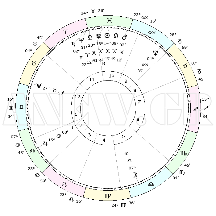 | | ΘΕΣΕΙΣ ΠΛΑΝΗΤΩΝ ΑΣΤΡΟΛΟΓΙΚΟΥ ΧΑΡΤΗ ΤΗΣ ΣΤΙΓΜΗΣ ΑΥΤΗΣ | | | | Πλανήτης | Ζώδιο | Μοίρες | Δεκαήμ. | Σε οίκο | Απόκλιση | | Ακμές των οίκων | | Ηλιος | Ιχθείς | 14°44' | Δεύτερο | 11 | 06 S 01 | | 1ος | 14°01' | Ταύρος | | Σελήνη | Ζυγός | 06°43' | Πρώτο | 6 | 04 S 56 | | 2ος | 12°30' | Δίδυμοι | | Ερμής | Ιχθείς | 18°57'R | Δεύτερο | 11 | 00 S 59 | | 3ος | 04°49' | Καρκίνος | | Αφροδίτη | Ιχθείς | 28°36' | Τρίτο | 12 | 01 S 44 | | 4ος | 26°45' | Καρκίνος | | Αρης | Ιχθείς | 02°09' | Πρώτο | 11 | 11 S 44 | | 5ος | 22°46' | Λέων | | Δίας | Καρκίνος | 15°08'R | Δεύτερο | 3 | 22 N 55 | | 6ος | 28°17' | Παρθένος | | Κρόνος | Κριός | 02°21' | Πρώτο | 12 | 01 S 01 | | 7ος | 14°01' | Σκορπιός | | Ουρανός | Ταύρος | 27°50' | Τρίτο | 1 | 19 N 30 | | 8ος | 12°30' | Τοξότης | | Ποσειδώνας | Κριός | 01°12' | Πρώτο | 12 | 00 S 43 | | 9ος | 04°49' | Αιγόκερως | | Πλούτωνας | Υδροχόος | 04°39' | Πρώτο | 10 | 22 S 51 | | 10ος | 26°45' | Αιγόκερως | | Β. Δεσμός | Ιχθείς | 08°49' | Πρώτο | 11 | 08 S 16 | | 11ος | 22°46' | Υδροχόος | | Ωροσκόπος | Ταύρος | 14°01' | Δεύτερο | | | 12ος | 28°17' | Ιχθείς | | Μεσουράνημα | Αιγόκερως | 26°45' | Τρίτο | | | |