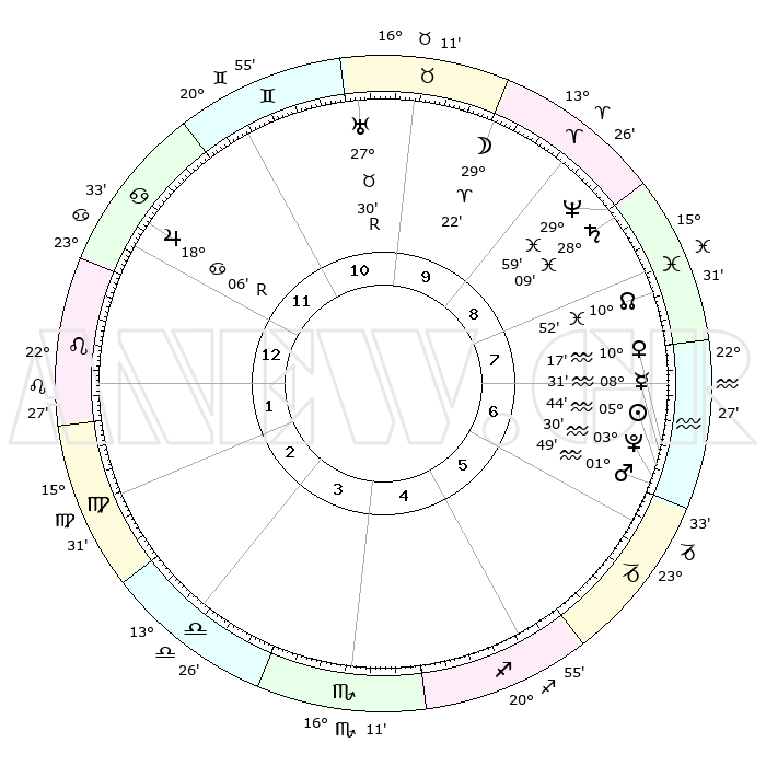 | | ΘΕΣΕΙΣ ΠΛΑΝΗΤΩΝ ΑΣΤΡΟΛΟΓΙΚΟΥ ΧΑΡΤΗ ΤΗΣ ΣΤΙΓΜΗΣ ΑΥΤΗΣ | | | | Πλανήτης | Ζώδιο | Μοίρες | Δεκαήμ. | Σε οίκο | Απόκλιση | | Ακμές των οίκων | | Ηλιος | Υδροχόος | 05°40' | Πρώτο | 7 | 18 S 51 | | 1ος | 04°21' | Λέων | | Σελήνη | Κριός | 28°30' | Τρίτο | 10 | 14 N 37 | | 2ος | 25°42' | Λέων | | Ερμής | Υδροχόος | 08°24' | Πρώτο | 7 | 20 S 10 | | 3ος | 21°20' | Παρθένος | | Αφροδίτη | Υδροχόος | 10°13' | Δεύτερο | 7 | 18 S 53 | | 4ος | 22°53' | Ζυγός | | Αρης | Υδροχόος | 01°46' | Πρώτο | 6 | 20 S 45 | | 5ος | 28°47' | Σκορπιός | | Δίας | Καρκίνος | 18°06'R | Δεύτερο | 12 | 22 N 30 | | 6ος | 03°47' | Αιγόκερως | | Κρόνος | Ιχθείς | 28°09' | Τρίτο | 9 | 02 S 45 | | 7ος | 04°21' | Υδροχόος | | Ουρανός | Ταύρος | 27°30'R | Τρίτο | 10 | 19 N 25 | | 8ος | 25°42' | Υδροχόος | | Ποσειδώνας | Ιχθείς | 29°59' | Τρίτο | 9 | 01 S 13 | | 9ος | 21°20' | Ιχθείς | | Πλούτωνας | Υδροχόος | 03°30' | Πρώτο | 6 | 23 S 04 | | 10ος | 22°53' | Κριός | | Β. Δεσμός | Ιχθείς | 10°52' | Δεύτερο | 8 | 07 S 29 | | 11ος | 28°47' | Ταύρος | | Ωροσκόπος | Λέων | 04°21' | Πρώτο | | | 12ος | 03°47' | Καρκίνος | | Μεσουράνημα | Κριός | 22°53' | Τρίτο | | | |