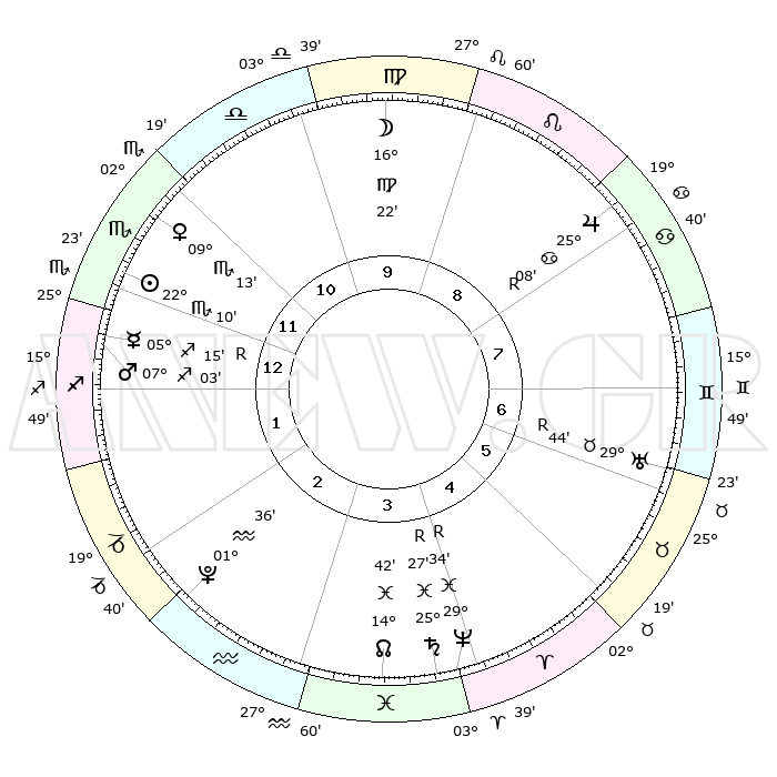| | ΘΕΣΕΙΣ ΠΛΑΝΗΤΩΝ ΑΣΤΡΟΛΟΓΙΚΟΥ ΧΑΡΤΗ ΤΗΣ ΣΤΙΓΜΗΣ ΑΥΤΗΣ | | | | Πλανήτης | Ζώδιο | Μοίρες | Δεκαήμ. | Σε οίκο | Απόκλιση | | Ακμές των οίκων | | Ηλιος | Σκορπιός | 22°06' | Τρίτο | 12 | 18 S 17 | | 1ος | 26°37' | Σκορπιός | | Σελήνη | Παρθένος | 15°34' | Δεύτερο | 10 | 05 N 44 | | 2ος | 27°18' | Τοξότης | | Ερμής | Τοξότης | 05°17'R | Πρώτο | 1 | 22 S 35 | | 3ος | 02°28' | Υδροχόος | | Αφροδίτη | Σκορπιός | 09°09' | Πρώτο | 12 | 13 S 23 | | 4ος | 08°24' | Ιχθείς | | Αρης | Τοξότης | 06°60' | Πρώτο | 1 | 21 S 59 | | 5ος | 09°50' | Κριός | | Δίας | Καρκίνος | 25°08'R | Τρίτο | 8 | 21 N 13 | | 6ος | 05°21' | Ταύρος | | Κρόνος | Ιχθείς | 25°27'R | Τρίτο | 4 | 04 S 02 | | 7ος | 26°37' | Ταύρος | | Ουρανός | Ταύρος | 29°45'R | Τρίτο | 7 | 19 N 53 | | 8ος | 27°18' | Δίδυμοι | | Ποσειδώνας | Ιχθείς | 29°34'R | Τρίτο | 4 | 01 S 25 | | 9ος | 02°28' | Λέων | | Πλούτωνας | Υδροχόος | 01°36' | Πρώτο | 2 | 23 S 28 | | 10ος | 08°24' | Παρθένος | | Β. Δεσμός | Ιχθείς | 14°42' | Δεύτερο | 4 | 06 S 01 | | 11ος | 09°50' | Ζυγός | | Ωροσκόπος | Σκορπιός | 26°37' | Τρίτο | | | 12ος | 05°21' | Σκορπιός | | Μεσουράνημα | Παρθένος | 08°24' | Πρώτο | | | |