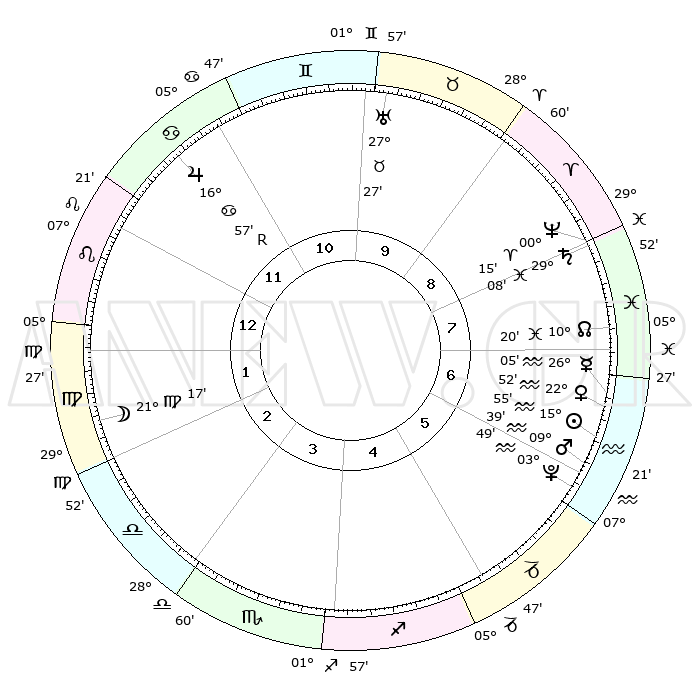 | | ΘΕΣΕΙΣ ΠΛΑΝΗΤΩΝ ΑΣΤΡΟΛΟΓΙΚΟΥ ΧΑΡΤΗ ΤΗΣ ΣΤΙΓΜΗΣ ΑΥΤΗΣ | | | | Πλανήτης | Ζώδιο | Μοίρες | Δεκαήμ. | Σε οίκο | Απόκλιση | | Ακμές των οίκων | | Ηλιος | Υδροχόος | 15°49' | Δεύτερο | 7 | 16 S 05 | | 1ος | 11°28' | Λέων | | Σελήνη | Παρθένος | 20°12' | Τρίτο | 2 | 02 N 57 | | 2ος | 03°26' | Παρθένος | | Ερμής | Υδροχόος | 25°56' | Τρίτο | 7 | 14 S 22 | | 3ος | 00°01' | Ζυγός | | Αφροδίτη | Υδροχόος | 22°45' | Τρίτο | 7 | 15 S 15 | | 4ος | 02°12' | Σκορπιός | | Αρης | Υδροχόος | 09°35' | Πρώτο | 6 | 18 S 52 | | 5ος | 07°43' | Τοξότης | | Δίας | Καρκίνος | 16°58'R | Δεύτερο | 12 | 22 N 40 | | 6ος | 11°40' | Αιγόκερως | | Κρόνος | Ιχθείς | 29°07' | Τρίτο | 8 | 02 S 20 | | 7ος | 11°28' | Υδροχόος | | Ουρανός | Ταύρος | 27°27' | Τρίτο | 10 | 19 N 24 | | 8ος | 03°26' | Ιχθείς | | Ποσειδώνας | Κριός | 00°15' | Πρώτο | 9 | 01 S 06 | | 9ος | 00°01' | Κριός | | Πλούτωνας | Υδροχόος | 03°49' | Πρώτο | 6 | 23 S 00 | | 10ος | 02°12' | Ταύρος | | Β. Δεσμός | Ιχθείς | 10°20' | Δεύτερο | 8 | 07 S 41 | | 11ος | 07°43' | Δίδυμοι | | Ωροσκόπος | Λέων | 11°28' | Δεύτερο | | | 12ος | 11°40' | Καρκίνος | | Μεσουράνημα | Ταύρος | 02°12' | Πρώτο | | | |