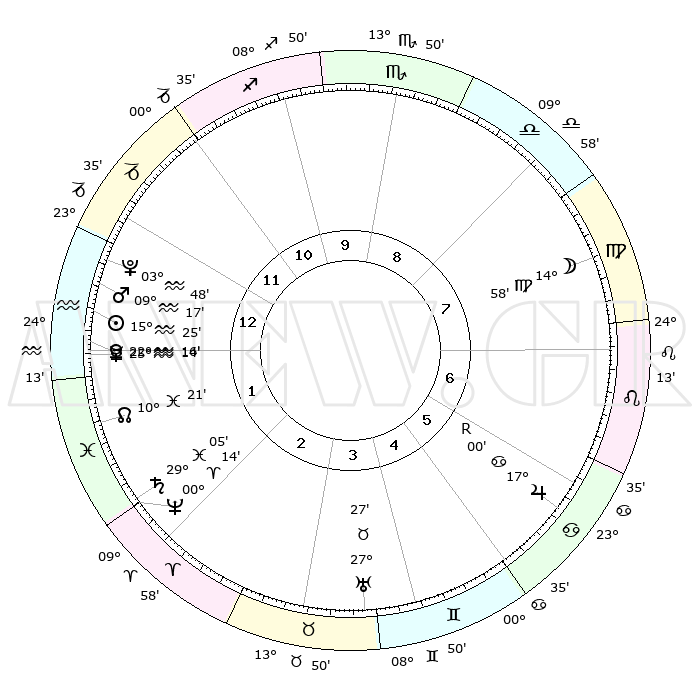 | | ΘΕΣΕΙΣ ΠΛΑΝΗΤΩΝ ΑΣΤΡΟΛΟΓΙΚΟΥ ΧΑΡΤΗ ΤΗΣ ΣΤΙΓΜΗΣ ΑΥΤΗΣ | | | | Πλανήτης | Ζώδιο | Μοίρες | Δεκαήμ. | Σε οίκο | Απόκλιση | | Ακμές των οίκων | | Ηλιος | Υδροχόος | 15°22' | Δεύτερο | 1 | 16 S 13 | | 1ος | 00°53' | Υδροχόος | | Σελήνη | Παρθένος | 14°18' | Δεύτερο | 7 | 05 N 44 | | 2ος | 15°08' | Ιχθείς | | Ερμής | Υδροχόος | 25°09' | Τρίτο | 1 | 14 S 41 | | 3ος | 23°26' | Κριός | | Αφροδίτη | Υδροχόος | 22°12' | Τρίτο | 1 | 15 S 26 | | 4ος | 21°45' | Ταύρος | | Αρης | Υδροχόος | 09°14' | Πρώτο | 1 | 18 S 57 | | 5ος | 14°27' | Δίδυμοι | | Δίας | Καρκίνος | 17°01'R | Δεύτερο | 6 | 22 N 40 | | 6ος | 05°54' | Καρκίνος | | Κρόνος | Ιχθείς | 29°05' | Τρίτο | 2 | 02 S 21 | | 7ος | 00°53' | Λέων | | Ουρανός | Ταύρος | 27°27' | Τρίτο | 4 | 19 N 24 | | 8ος | 15°08' | Παρθένος | | Ποσειδώνας | Κριός | 00°14' | Πρώτο | 2 | 01 S 07 | | 9ος | 23°26' | Ζυγός | | Πλούτωνας | Υδροχόος | 03°48' | Πρώτο | 1 | 23 S 00 | | 10ος | 21°45' | Σκορπιός | | Β. Δεσμός | Ιχθείς | 10°21' | Δεύτερο | 1 | 07 S 41 | | 11ος | 14°27' | Τοξότης | | Ωροσκόπος | Υδροχόος | 00°53' | Πρώτο | | | 12ος | 05°54' | Αιγόκερως | | Μεσουράνημα | Σκορπιός | 21°45' | Τρίτο | | | |