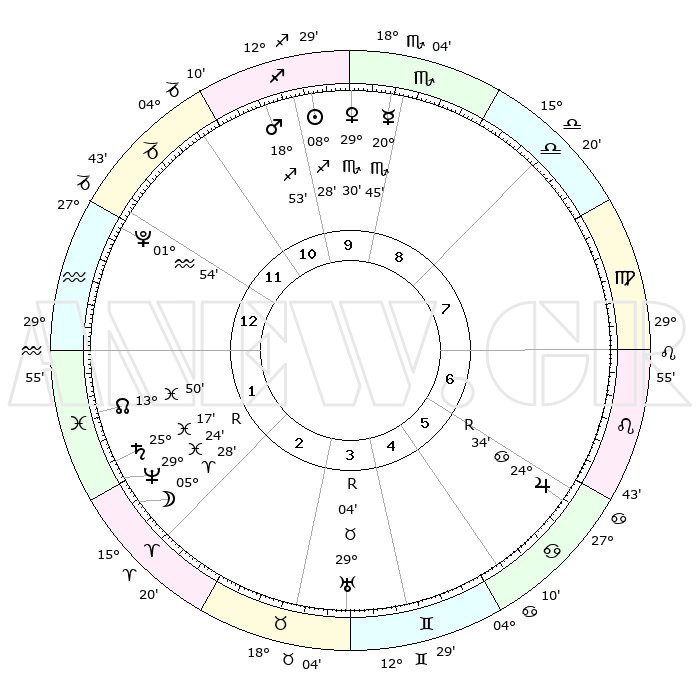 | | ΘΕΣΕΙΣ ΠΛΑΝΗΤΩΝ ΑΣΤΡΟΛΟΓΙΚΟΥ ΧΑΡΤΗ ΤΗΣ ΣΤΙΓΜΗΣ ΑΥΤΗΣ | | | | Πλανήτης | Ζώδιο | Μοίρες | Δεκαήμ. | Σε οίκο | Απόκλιση | | Ακμές των οίκων | | Ηλιος | Τοξότης | 08°26' | Πρώτο | 10 | 21 S 42 | | 1ος | 08°45' | Υδροχόος | | Σελήνη | Κριός | 04°52' | Πρώτο | 2 | 03 N 34 | | 2ος | 24°01' | Ιχθείς | | Ερμής | Σκορπιός | 20°45' | Τρίτο | 9 | 15 S 27 | | 3ος | 00°56' | Ταύρος | | Αφροδίτη | Σκορπιός | 29°27' | Τρίτο | 10 | 19 S 19 | | 4ος | 27°59' | Ταύρος | | Αρης | Τοξότης | 18°51' | Δεύτερο | 10 | 23 S 37 | | 5ος | 20°12' | Δίδυμοι | | Δίας | Καρκίνος | 24°34'R | Τρίτο | 6 | 21 N 21 | | 6ος | 12°02' | Καρκίνος | | Κρόνος | Ιχθείς | 25°17' | Τρίτο | 2 | 04 S 03 | | 7ος | 08°45' | Λέων | | Ουρανός | Ταύρος | 29°04'R | Τρίτο | 4 | 19 N 45 | | 8ος | 24°01' | Παρθένος | | Ποσειδώνας | Ιχθείς | 29°24'R | Τρίτο | 2 | 01 S 29 | | 9ος | 00°56' | Σκορπιός | | Πλούτωνας | Υδροχόος | 01°54' | Πρώτο | 12 | 23 S 24 | | 10ος | 27°59' | Σκορπιός | | Β. Δεσμός | Ιχθείς | 13°51' | Δεύτερο | 1 | 06 S 21 | | 11ος | 20°12' | Τοξότης | | Ωροσκόπος | Υδροχόος | 08°45' | Πρώτο | | | 12ος | 12°02' | Αιγόκερως | | Μεσουράνημα | Σκορπιός | 27°59' | Τρίτο | | | |