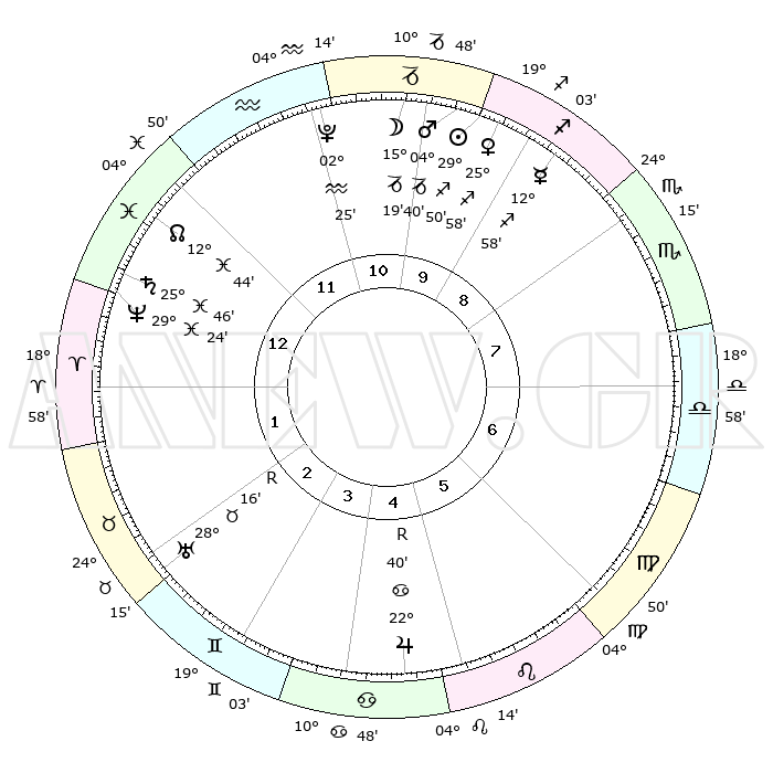 | | ΘΕΣΕΙΣ ΠΛΑΝΗΤΩΝ ΑΣΤΡΟΛΟΓΙΚΟΥ ΧΑΡΤΗ ΤΗΣ ΣΤΙΓΜΗΣ ΑΥΤΗΣ | | | | Πλανήτης | Ζώδιο | Μοίρες | Δεκαήμ. | Σε οίκο | Απόκλιση | | Ακμές των οίκων | | Ηλιος | Τοξότης | 29°46' | Τρίτο | 10 | 23 S 26 | | 1ος | 11°18' | Ιχθείς | | Σελήνη | Αιγόκερως | 14°32' | Δεύτερο | 11 | 26 S 50 | | 2ος | 25°23' | Κριός | | Ερμής | Τοξότης | 12°52' | Δεύτερο | 9 | 21 S 38 | | 3ος | 25°57' | Ταύρος | | Αφροδίτη | Τοξότης | 25°53' | Τρίτο | 10 | 23 S 28 | | 4ος | 19°21' | Δίδυμοι | | Αρης | Αιγόκερως | 04°37' | Πρώτο | 10 | 24 S 10 | | 5ος | 11°07' | Καρκίνος | | Δίας | Καρκίνος | 22°40'R | Τρίτο | 5 | 21 N 44 | | 6ος | 05°56' | Λέων | | Κρόνος | Ιχθείς | 25°46' | Τρίτο | 1 | 03 S 48 | | 7ος | 11°18' | Παρθένος | | Ουρανός | Ταύρος | 28°16'R | Τρίτο | 3 | 19 N 34 | | 8ος | 25°23' | Ζυγός | | Ποσειδώνας | Ιχθείς | 29°24' | Τρίτο | 1 | 01 S 28 | | 9ος | 25°57' | Σκορπιός | | Πλούτωνας | Υδροχόος | 02°25' | Πρώτο | 11 | 23 S 17 | | 10ος | 19°21' | Τοξότης | | Β. Δεσμός | Ιχθείς | 12°44' | Δεύτερο | 1 | 06 S 47 | | 11ος | 11°07' | Αιγόκερως | | Ωροσκόπος | Ιχθείς | 11°18' | Δεύτερο | | | 12ος | 05°56' | Υδροχόος | | Μεσουράνημα | Τοξότης | 19°21' | Δεύτερο | | | |