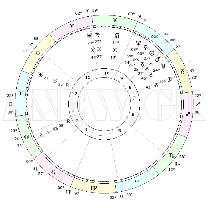 | | ΘΕΣΕΙΣ ΠΛΑΝΗΤΩΝ ΑΣΤΡΟΛΟΓΙΚΟΥ ΧΑΡΤΗ ΤΗΣ ΣΤΙΓΜΗΣ ΑΥΤΗΣ | | | | Πλανήτης | Ζώδιο | Μοίρες | Δεκαήμ. | Σε οίκο | Απόκλιση | | Ακμές των οίκων | | Ηλιος | Αιγόκερως | 27°20' | Τρίτο | 9 | 20 S 41 | | 1ος | 19°43' | Ταύρος | | Σελήνη | Αιγόκερως | 11°42' | Δεύτερο | 9 | 27 S 16 | | 2ος | 16°48' | Δίδυμοι | | Ερμής | Αιγόκερως | 24°39' | Τρίτο | 9 | 23 S 04 | | 3ος | 08°43' | Καρκίνος | | Αφροδίτη | Αιγόκερως | 29°55' | Τρίτο | 9 | 21 S 11 | | 4ος | 00°52' | Λέων | | Αρης | Αιγόκερως | 25°24' | Τρίτο | 9 | 22 S 01 | | 5ος | 27°41' | Λέων | | Δίας | Καρκίνος | 19°09'R | Δεύτερο | 3 | 22 N 20 | | 6ος | 04°19' | Ζυγός | | Κρόνος | Ιχθείς | 27°27' | Τρίτο | 11 | 03 S 03 | | 7ος | 19°43' | Σκορπιός | | Ουρανός | Ταύρος | 27°35'R | Τρίτο | 1 | 19 N 26 | | 8ος | 16°48' | Τοξότης | | Ποσειδώνας | Ιχθείς | 29°47' | Τρίτο | 11 | 01 S 18 | | 9ος | 08°43' | Αιγόκερως | | Πλούτωνας | Υδροχόος | 03°14' | Πρώτο | 10 | 23 S 07 | | 10ος | 00°52' | Υδροχόος | | Β. Δεσμός | Ιχθείς | 11°18' | Δεύτερο | 11 | 07 S 20 | | 11ος | 27°41' | Υδροχόος | | Ωροσκόπος | Ταύρος | 19°43' | Δεύτερο | | | 12ος | 04°20' | Κριός | | Μεσουράνημα | Υδροχόος | 00°52' | Πρώτο | | | |