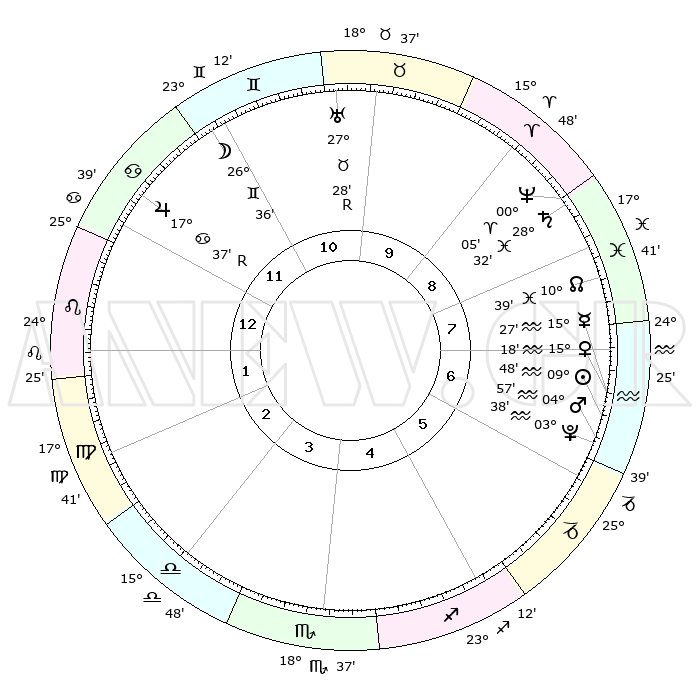 | | ΘΕΣΕΙΣ ΠΛΑΝΗΤΩΝ ΑΣΤΡΟΛΟΓΙΚΟΥ ΧΑΡΤΗ ΤΗΣ ΣΤΙΓΜΗΣ ΑΥΤΗΣ | | | | Πλανήτης | Ζώδιο | Μοίρες | Δεκαήμ. | Σε οίκο | Απόκλιση | | Ακμές των οίκων | | Ηλιος | Υδροχόος | 09°44' | Πρώτο | 7 | 17 S 48 | | 1ος | 07°19' | Λέων | | Σελήνη | Δίδυμοι | 25°44' | Τρίτο | 11 | 28 N 21 | | 2ος | 28°55' | Λέων | | Ερμής | Υδροχόος | 15°21' | Δεύτερο | 7 | 18 S 08 | | 3ος | 24°57' | Παρθένος | | Αφροδίτη | Υδροχόος | 15°14' | Δεύτερο | 7 | 17 S 32 | | 4ος | 26°47' | Ζυγός | | Αρης | Υδροχόος | 04°54' | Πρώτο | 6 | 20 S 02 | | 5ος | 02°33' | Τοξότης | | Δίας | Καρκίνος | 17°37'R | Δεύτερο | 12 | 22 N 34 | | 6ος | 07°06' | Αιγόκερως | | Κρόνος | Ιχθείς | 28°32' | Τρίτο | 9 | 02 S 35 | | 7ος | 07°19' | Υδροχόος | | Ουρανός | Ταύρος | 27°28'R | Τρίτο | 10 | 19 N 24 | | 8ος | 28°55' | Υδροχόος | | Ποσειδώνας | Κριός | 00°05' | Πρώτο | 9 | 01 S 11 | | 9ος | 24°57' | Ιχθείς | | Πλούτωνας | Υδροχόος | 03°38' | Πρώτο | 6 | 23 S 02 | | 10ος | 26°47' | Κριός | | Β. Δεσμός | Ιχθείς | 10°39' | Δεύτερο | 8 | 07 S 34 | | 11ος | 02°33' | Δίδυμοι | | Ωροσκόπος | Λέων | 07°19' | Πρώτο | | | 12ος | 07°06' | Καρκίνος | | Μεσουράνημα | Κριός | 26°47' | Τρίτο | | | |