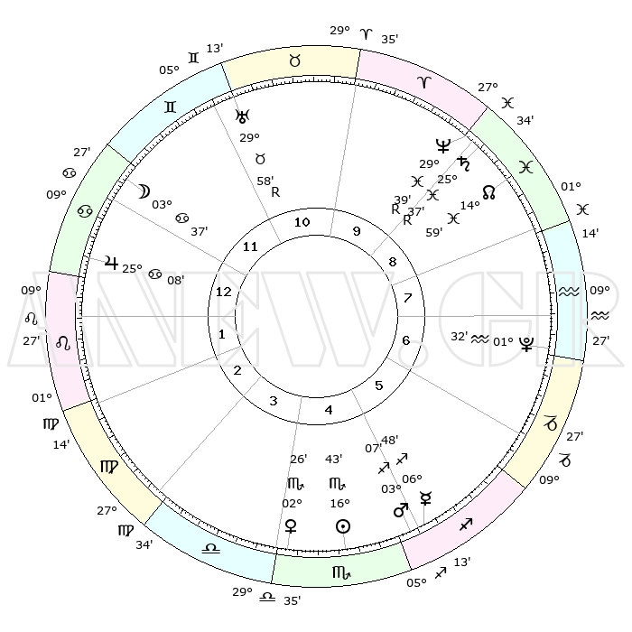 | | ΘΕΣΕΙΣ ΠΛΑΝΗΤΩΝ ΑΣΤΡΟΛΟΓΙΚΟΥ ΧΑΡΤΗ ΤΗΣ ΣΤΙΓΜΗΣ ΑΥΤΗΣ | | | | Πλανήτης | Ζώδιο | Μοίρες | Δεκαήμ. | Σε οίκο | Απόκλιση | | Ακμές των οίκων | | Ηλιος | Σκορπιός | 16°38' | Δεύτερο | 5 | 16 S 48 | | 1ος | 15°55' | Καρκίνος | | Σελήνη | Καρκίνος | 02°26' | Πρώτο | 12 | 28 N 17 | | 2ος | 06°21' | Λέων | | Ερμής | Τοξότης | 06°47' | Πρώτο | 5 | 23 S 54 | | 3ος | 29°36' | Λέων | | Αφροδίτη | Σκορπιός | 02°20' | Πρώτο | 4 | 11 S 01 | | 4ος | 28°34' | Παρθένος | | Αρης | Τοξότης | 03°04' | Πρώτο | 5 | 21 S 13 | | 5ος | 04°21' | Σκορπιός | | Δίας | Καρκίνος | 25°08' | Τρίτο | 1 | 21 N 12 | | 6ος | 12°24' | Τοξότης | | Κρόνος | Ιχθείς | 25°37'R | Τρίτο | 9 | 03 S 59 | | 7ος | 15°55' | Αιγόκερως | | Ουρανός | Ταύρος | 29°58'R | Τρίτο | 11 | 19 N 56 | | 8ος | 06°21' | Υδροχόος | | Ποσειδώνας | Ιχθείς | 29°39'R | Τρίτο | 10 | 01 S 24 | | 9ος | 29°36' | Υδροχόος | | Πλούτωνας | Υδροχόος | 01°32' | Πρώτο | 7 | 23 S 29 | | 10ος | 28°34' | Ιχθείς | | Β. Δεσμός | Ιχθείς | 14°59' | Δεύτερο | 9 | 05 S 55 | | 11ος | 04°21' | Ταύρος | | Ωροσκόπος | Καρκίνος | 15°55' | Δεύτερο | | | 12ος | 12°24' | Δίδυμοι | | Μεσουράνημα | Ιχθείς | 28°34' | Τρίτο | | | |