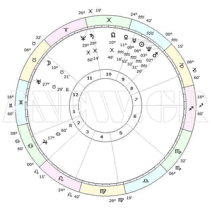 | | ΘΕΣΕΙΣ ΠΛΑΝΗΤΩΝ ΑΣΤΡΟΛΟΓΙΚΟΥ ΧΑΡΤΗ ΤΗΣ ΣΤΙΓΜΗΣ ΑΥΤΗΣ | | | | Πλανήτης | Ζώδιο | Μοίρες | Δεκαήμ. | Σε οίκο | Απόκλιση | | Ακμές των οίκων | | Ηλιος | Υδροχόος | 06°27' | Πρώτο | 10 | 18 S 39 | | 1ος | 14°13' | Ταύρος | | Σελήνη | Ταύρος | 09°16' | Πρώτο | 12 | 18 N 50 | | 2ος | 12°39' | Δίδυμοι | | Ερμής | Υδροχόος | 09°44' | Πρώτο | 10 | 19 S 49 | | 3ος | 04°57' | Καρκίνος | | Αφροδίτη | Υδροχόος | 11°11' | Δεύτερο | 10 | 18 S 38 | | 4ος | 26°53' | Καρκίνος | | Αρης | Υδροχόος | 02°22' | Πρώτο | 10 | 20 S 37 | | 5ος | 22°56' | Λέων | | Δίας | Καρκίνος | 18°00'R | Δεύτερο | 3 | 22 N 31 | | 6ος | 28°29' | Παρθένος | | Κρόνος | Ιχθείς | 28°13' | Τρίτο | 11 | 02 S 43 | | 7ος | 14°13' | Σκορπιός | | Ουρανός | Ταύρος | 27°29'R | Τρίτο | 1 | 19 N 25 | | 8ος | 12°39' | Τοξότης | | Ποσειδώνας | Ιχθείς | 29°60' | Τρίτο | 12 | 01 S 13 | | 9ος | 04°57' | Αιγόκερως | | Πλούτωνας | Υδροχόος | 03°31' | Πρώτο | 10 | 23 S 03 | | 10ος | 26°53' | Αιγόκερως | | Β. Δεσμός | Ιχθείς | 10°49' | Δεύτερο | 11 | 07 S 30 | | 11ος | 22°56' | Υδροχόος | | Ωροσκόπος | Ταύρος | 14°13' | Δεύτερο | | | 12ος | 28°29' | Ιχθείς | | Μεσουράνημα | Αιγόκερως | 26°53' | Τρίτο | | | |