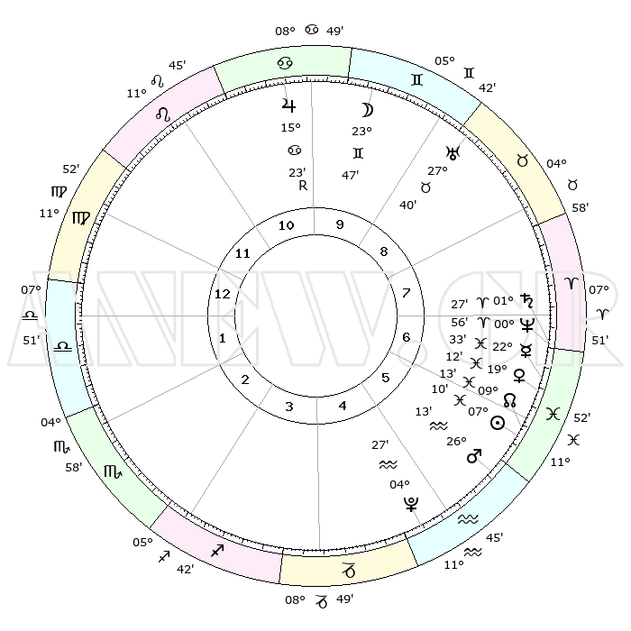 | | ΘΕΣΕΙΣ ΠΛΑΝΗΤΩΝ ΑΣΤΡΟΛΟΓΙΚΟΥ ΧΑΡΤΗ ΤΗΣ ΣΤΙΓΜΗΣ ΑΥΤΗΣ | | | | Πλανήτης | Ζώδιο | Μοίρες | Δεκαήμ. | Σε οίκο | Απόκλιση | | Ακμές των οίκων | | Ηλιος | Ιχθείς | 07°06' | Πρώτο | 6 | 08 S 54 | | 1ος | 16°21' | Παρθένος | | Σελήνη | Δίδυμοι | 22°45' | Τρίτο | 10 | 28 N 21 | | 2ος | 11°49' | Ζυγός | | Ερμής | Ιχθείς | 22°32' | Τρίτο | 7 | 00 S 31 | | 3ος | 11°39' | Σκορπιός | | Αφροδίτη | Ιχθείς | 19°07' | Δεύτερο | 7 | 05 S 36 | | 4ος | 14°35' | Τοξότης | | Αρης | Υδροχόος | 26°09' | Τρίτο | 6 | 13 S 49 | | 5ος | 17°54' | Αιγόκερως | | Δίας | Καρκίνος | 15°23'R | Δεύτερο | 10 | 22 N 53 | | 6ος | 18°53' | Υδροχόος | | Κρόνος | Κριός | 01°27' | Πρώτο | 7 | 01 S 23 | | 7ος | 16°21' | Ιχθείς | | Ουρανός | Ταύρος | 27°40' | Τρίτο | 9 | 19 N 27 | | 8ος | 11°49' | Κριός | | Ποσειδώνας | Κριός | 00°56' | Πρώτο | 7 | 00 S 50 | | 9ος | 11°39' | Ταύρος | | Πλούτωνας | Υδροχόος | 04°27' | Πρώτο | 5 | 22 S 53 | | 10ος | 14°35' | Δίδυμοι | | Β. Δεσμός | Ιχθείς | 09°13' | Πρώτο | 6 | 08 S 07 | | 11ος | 17°54' | Καρκίνος | | Ωροσκόπος | Παρθένος | 16°21' | Δεύτερο | | | 12ος | 18°53' | Λέων | | Μεσουράνημα | Δίδυμοι | 14°35' | Δεύτερο | | | |