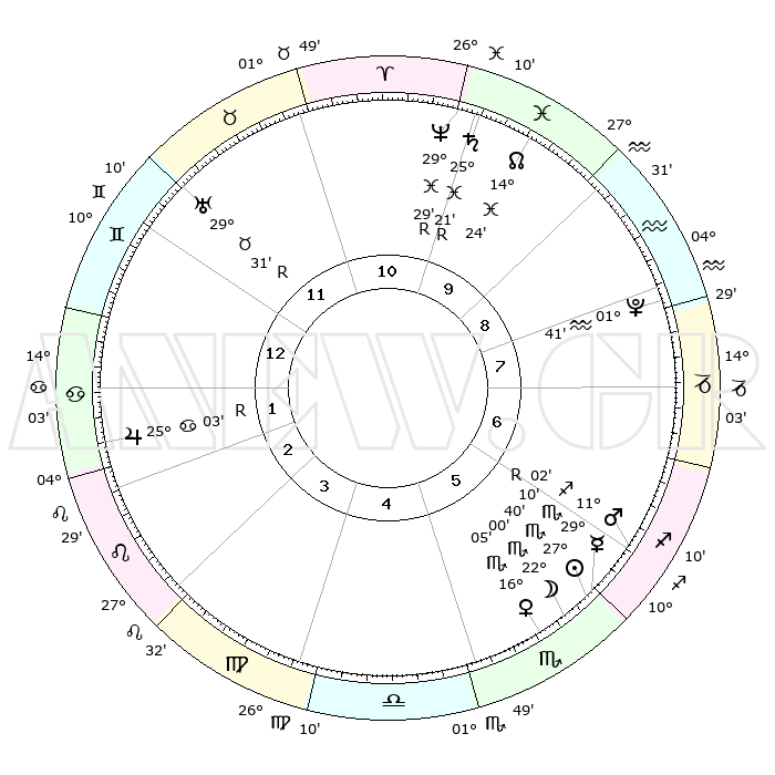| | ΘΕΣΕΙΣ ΠΛΑΝΗΤΩΝ ΑΣΤΡΟΛΟΓΙΚΟΥ ΧΑΡΤΗ ΤΗΣ ΣΤΙΓΜΗΣ ΑΥΤΗΣ | | | | Πλανήτης | Ζώδιο | Μοίρες | Δεκαήμ. | Σε οίκο | Απόκλιση | | Ακμές των οίκων | | Ηλιος | Σκορπιός | 27°36' | Τρίτο | 6 | 19 S 37 | | 1ος | 23°06' | Δίδυμοι | | Σελήνη | Σκορπιός | 21°14' | Τρίτο | 6 | 22 S 28 | | 2ος | 14°26' | Καρκίνος | | Ερμής | Σκορπιός | 29°15'R | Τρίτο | 6 | 19 S 41 | | 3ος | 05°52' | Λέων | | Αφροδίτη | Σκορπιός | 16°00' | Δεύτερο | 6 | 15 S 36 | | 4ος | 01°08' | Παρθένος | | Αρης | Τοξότης | 10°59' | Δεύτερο | 6 | 22 S 39 | | 5ος | 03°54' | Ζυγός | | Δίας | Καρκίνος | 25°03'R | Τρίτο | 2 | 21 N 15 | | 6ος | 14°11' | Σκορπιός | | Κρόνος | Ιχθείς | 25°21'R | Τρίτο | 10 | 04 S 04 | | 7ος | 23°06' | Τοξότης | | Ουρανός | Ταύρος | 29°31'R | Τρίτο | 12 | 19 N 50 | | 8ος | 14°26' | Αιγόκερως | | Ποσειδώνας | Ιχθείς | 29°30'R | Τρίτο | 10 | 01 S 27 | | 9ος | 05°52' | Υδροχόος | | Πλούτωνας | Υδροχόος | 01°41' | Πρώτο | 8 | 23 S 27 | | 10ος | 01°08' | Ιχθείς | | Β. Δεσμός | Ιχθείς | 14°25' | Δεύτερο | 10 | 06 S 08 | | 11ος | 03°54' | Κριός | | Ωροσκόπος | Δίδυμοι | 23°06' | Τρίτο | | | 12ος | 14°11' | Ταύρος | | Μεσουράνημα | Ιχθείς | 01°08' | Πρώτο | | | |