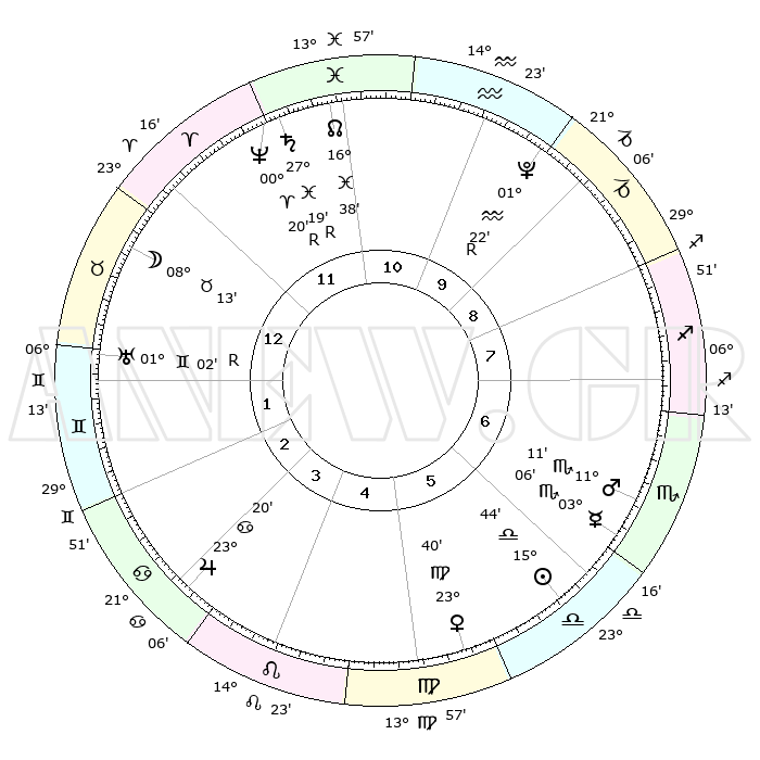 | ΘΕΣΕΙΣ ΠΛΑΝΗΤΩΝ ΑΣΤΡΟΛΟΓΙΚΟΥ ΧΑΡΤΗ ΤΗΣ ΣΤΙΓΜΗΣ ΑΥΤΗΣ | | Πλανήτης | Ζώδιο | Μοίρες | Δεκαήμ. | Σε οίκο | Απόκλιση | | Ακμές των οίκων | Ηλιος | Ζυγός | 15°38' | Δεύτερο | 6 | 06 S 09 | | 1ος | 16°36' | Κριός | Σελήνη | Ταύρος | 06°41' | Πρώτο | 1 | 17 N 26 | | 2ος | 22°33' | Ταύρος | Ερμής | Σκορπιός | 02°57' | Πρώτο | 7 | 13 S 27 | | 3ος | 17°38' | Δίδυμοι | Αφροδίτη | Παρθένος | 23°32' | Τρίτο | 6 | 03 N 53 | | 4ος | 09°25' | Καρκίνος | Αρης | Σκορπιός | 11°07' | Δεύτερο | 7 | 15 S 19 | | 5ος | 02°41' | Λέων | Δίας | Καρκίνος | 23°20' | Τρίτο | 4 | 21 N 27 | | 6ος | 02°51' | Παρθένος | Κρόνος | Ιχθείς | 27°19'R | Τρίτο | 12 | 03 S 22 | | 7ος | 16°36' | Ζυγός | Ουρανός | Δίδυμοι | 01°02'R | Πρώτο | 2 | 20 N 09 | | 8ος | 22°33' | Σκορπιός | Ποσειδώνας | Κριός | 00°20'R | Πρώτο | 12 | 01 S 08 | | 9ος | 17°38' | Τοξότης | Πλούτωνας | Υδροχόος | 01°22'R | Πρώτο | 10 | 23 S 32 | | 10ος | 09°25' | Αιγόκερως | Β. Δεσμός | Ιχθείς | 16°38' | Δεύτερο | 12 | 05 S 16 | | 11ος | 02°41' | Υδροχόος | Ωροσκόπος | Κριός | 16°36' | Δεύτερο | | | 12ος | 02°51' | Ιχθείς | Μεσουράνημα | Αιγόκερως | 09°25' | Πρώτο | | | |