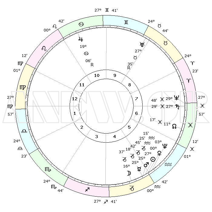 | | ΘΕΣΕΙΣ ΠΛΑΝΗΤΩΝ ΑΣΤΡΟΛΟΓΙΚΟΥ ΧΑΡΤΗ ΤΗΣ ΣΤΙΓΜΗΣ ΑΥΤΗΣ | | | | Πλανήτης | Ζώδιο | Μοίρες | Δεκαήμ. | Σε οίκο | Απόκλιση | | Ακμές των οίκων | | Ηλιος | Αιγόκερως | 27°40' | Τρίτο | 5 | 20 S 37 | | 1ος | 06°30' | Παρθένος | | Σελήνη | Αιγόκερως | 15°43' | Δεύτερο | 5 | 26 S 38 | | 2ος | 01°02' | Ζυγός | | Ερμής | Αιγόκερως | 25°11' | Τρίτο | 5 | 22 S 59 | | 3ος | 00°15' | Σκορπιός | | Αφροδίτη | Υδροχόος | 00°19' | Πρώτο | 5 | 21 S 07 | | 4ος | 03°12' | Τοξότης | | Αρης | Αιγόκερως | 25°39' | Τρίτο | 5 | 21 S 59 | | 5ος | 06°59' | Αιγόκερως | | Δίας | Καρκίνος | 19°06'R | Δεύτερο | 11 | 22 N 21 | | 6ος | 08°28' | Υδροχόος | | Κρόνος | Ιχθείς | 27°28' | Τρίτο | 7 | 03 S 02 | | 7ος | 06°30' | Ιχθείς | | Ουρανός | Ταύρος | 27°35'R | Τρίτο | 9 | 19 N 26 | | 8ος | 01°02' | Κριός | | Ποσειδώνας | Ιχθείς | 29°48' | Τρίτο | 7 | 01 S 18 | | 9ος | 00°15' | Ταύρος | | Πλούτωνας | Υδροχόος | 03°15' | Πρώτο | 5 | 23 S 07 | | 10ος | 03°12' | Δίδυμοι | | Β. Δεσμός | Ιχθείς | 11°17' | Δεύτερο | 7 | 07 S 20 | | 11ος | 06°59' | Καρκίνος | | Ωροσκόπος | Παρθένος | 06°30' | Πρώτο | | | 12ος | 08°28' | Λέων | | Μεσουράνημα | Δίδυμοι | 03°12' | Πρώτο | | | |