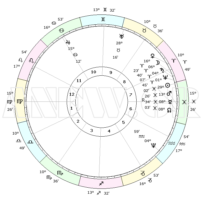 | | ΘΕΣΕΙΣ ΠΛΑΝΗΤΩΝ ΑΣΤΡΟΛΟΓΙΚΟΥ ΧΑΡΤΗ ΤΗΣ ΣΤΙΓΜΗΣ ΑΥΤΗΣ | | | | Πλανήτης | Ζώδιο | Μοίρες | Δεκαήμ. | Σε οίκο | Απόκλιση | | Ακμές των οίκων | | Ηλιος | Ιχθείς | 28°58' | Τρίτο | 8 | 00 S 25 | | 1ος | 23°20' | Λέων | | Σελήνη | Κριός | 05°36' | Πρώτο | 8 | 04 N 23 | | 2ος | 16°30' | Παρθένος | | Ερμής | Ιχθείς | 08°34'R | Πρώτο | 7 | 07 S 09 | | 3ος | 14°30' | Ζυγός | | Αφροδίτη | Κριός | 16°18' | Δεύτερο | 9 | 05 N 34 | | 4ος | 17°17' | Σκορπιός | | Αρης | Ιχθείς | 13°22' | Δεύτερο | 7 | 07 S 32 | | 5ος | 21°57' | Τοξότης | | Δίας | Καρκίνος | 15°12' | Δεύτερο | 11 | 22 N 56 | | 6ος | 24°30' | Αιγόκερως | | Κρόνος | Κριός | 04°07' | Πρώτο | 8 | 00 S 19 | | 7ος | 23°20' | Υδροχόος | | Ουρανός | Ταύρος | 28°16' | Τρίτο | 10 | 19 N 36 | | 8ος | 16°30' | Ιχθείς | | Ποσειδώνας | Κριός | 01°44' | Πρώτο | 8 | 00 S 30 | | 9ος | 14°30' | Κριός | | Πλούτωνας | Υδροχόος | 04°59' | Πρώτο | 6 | 22 S 49 | | 10ος | 17°17' | Ταύρος | | Β. Δεσμός | Ιχθείς | 08°04' | Πρώτο | 7 | 08 S 33 | | 11ος | 21°57' | Δίδυμοι | | Ωροσκόπος | Λέων | 23°20' | Τρίτο | | | 12ος | 24°30' | Καρκίνος | | Μεσουράνημα | Ταύρος | 17°17' | Δεύτερο | | | |