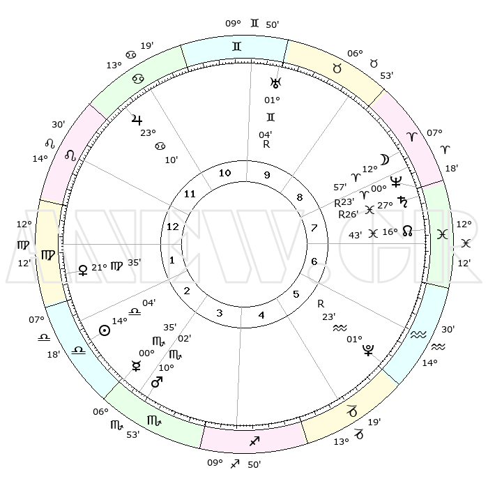 | ΘΕΣΕΙΣ ΠΛΑΝΗΤΩΝ ΑΣΤΡΟΛΟΓΙΚΟΥ ΧΑΡΤΗ ΤΗΣ ΣΤΙΓΜΗΣ ΑΥΤΗΣ | | Πλανήτης | Ζώδιο | Μοίρες | Δεκαήμ. | Σε οίκο | Απόκλιση | | Ακμές των οίκων | Ηλιος | Ζυγός | 13°58' | Δεύτερο | 3 | 05 S 30 | | 1ος | 14°20' | Λέων | Σελήνη | Κριός | 11°31' | Δεύτερο | 9 | 06 N 28 | | 2ος | 06°34' | Παρθένος | Ερμής | Σκορπιός | 00°27' | Πρώτο | 3 | 12 S 24 | | 3ος | 03°31' | Ζυγός | Αφροδίτη | Παρθένος | 21°28' | Τρίτο | 2 | 04 N 41 | | 4ος | 05°54' | Σκορπιός | Αρης | Σκορπιός | 09°58' | Πρώτο | 4 | 14 S 56 | | 5ος | 11°13' | Τοξότης | Δίας | Καρκίνος | 23°09' | Τρίτο | 12 | 21 N 29 | | 6ος | 14°47' | Αιγόκερως | Κρόνος | Ιχθείς | 27°27'R | Τρίτο | 8 | 03 S 19 | | 7ος | 14°20' | Υδροχόος | Ουρανός | Δίδυμοι | 01°04'R | Πρώτο | 10 | 20 N 10 | | 8ος | 06°34' | Ιχθείς | Ποσειδώνας | Κριός | 00°23'R | Πρώτο | 8 | 01 S 06 | | 9ος | 03°31' | Κριός | Πλούτωνας | Υδροχόος | 01°23'R | Πρώτο | 6 | 23 S 32 | | 10ος | 05°54' | Ταύρος | Β. Δεσμός | Ιχθείς | 16°43' | Δεύτερο | 8 | 05 S 14 | | 11ος | 11°13' | Δίδυμοι | Ωροσκόπος | Λέων | 14°20' | Δεύτερο | | | 12ος | 14°47' | Καρκίνος | Μεσουράνημα | Ταύρος | 05°54' | Πρώτο | | | |