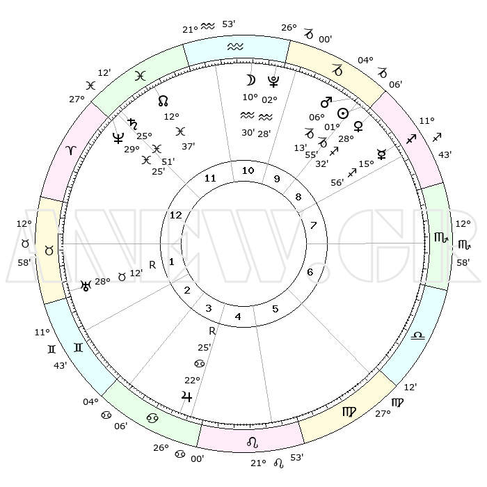 | | ΘΕΣΕΙΣ ΠΛΑΝΗΤΩΝ ΑΣΤΡΟΛΟΓΙΚΟΥ ΧΑΡΤΗ ΤΗΣ ΣΤΙΓΜΗΣ ΑΥΤΗΣ | | | | Πλανήτης | Ζώδιο | Μοίρες | Δεκαήμ. | Σε οίκο | Απόκλιση | | Ακμές των οίκων | | Ηλιος | Αιγόκερως | 01°50' | Πρώτο | 10 | 23 S 25 | | 1ος | 27°25' | Ιχθείς | | Σελήνη | Υδροχόος | 09°29' | Πρώτο | 11 | 20 S 27 | | 2ος | 08°19' | Ταύρος | | Ερμής | Τοξότης | 15°49' | Δεύτερο | 9 | 22 S 13 | | 3ος | 06°08' | Δίδυμοι | | Αφροδίτη | Τοξότης | 28°25' | Τρίτο | 9 | 23 S 36 | | 4ος | 28°33' | Δίδυμοι | | Αρης | Αιγόκερως | 06°09' | Πρώτο | 10 | 24 S 07 | | 5ος | 20°45' | Καρκίνος | | Δίας | Καρκίνος | 22°26'R | Τρίτο | 5 | 21 N 47 | | 6ος | 17°45' | Λέων | | Κρόνος | Ιχθείς | 25°51' | Τρίτο | 12 | 03 S 45 | | 7ος | 27°25' | Παρθένος | | Ουρανός | Ταύρος | 28°12'R | Τρίτο | 2 | 19 N 34 | | 8ος | 08°19' | Σκορπιός | | Ποσειδώνας | Ιχθείς | 29°25' | Τρίτο | 1 | 01 S 27 | | 9ος | 06°08' | Τοξότης | | Πλούτωνας | Υδροχόος | 02°28' | Πρώτο | 11 | 23 S 16 | | 10ος | 28°33' | Τοξότης | | Β. Δεσμός | Ιχθείς | 12°37' | Δεύτερο | 12 | 06 S 49 | | 11ος | 20°45' | Αιγόκερως | | Ωροσκόπος | Ιχθείς | 27°25' | Τρίτο | | | 12ος | 17°45' | Υδροχόος | | Μεσουράνημα | Τοξότης | 28°33' | Τρίτο | | | |