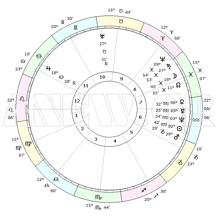 | | ΘΕΣΕΙΣ ΠΛΑΝΗΤΩΝ ΑΣΤΡΟΛΟΓΙΚΟΥ ΧΑΡΤΗ ΤΗΣ ΣΤΙΓΜΗΣ ΑΥΤΗΣ | | | | Πλανήτης | Ζώδιο | Μοίρες | Δεκαήμ. | Σε οίκο | Απόκλιση | | Ακμές των οίκων | | Ηλιος | Υδροχόος | 02°37' | Πρώτο | 7 | 19 S 34 | | 1ος | 29°44' | Καρκίνος | | Σελήνη | Ιχθείς | 17°44' | Δεύτερο | 9 | 04 S 09 | | 2ος | 20°45' | Λέων | | Ερμής | Υδροχόος | 03°17' | Πρώτο | 7 | 21 S 26 | | 3ος | 15°46' | Παρθένος | | Αφροδίτη | Υδροχόος | 06°26' | Πρώτο | 7 | 19 S 48 | | 4ος | 16°46' | Ζυγός | | Αρης | Αιγόκερως | 29°26' | Τρίτο | 6 | 21 S 15 | | 5ος | 22°49' | Σκορπιός | | Δίας | Καρκίνος | 18°29'R | Δεύτερο | 12 | 22 N 27 | | 6ος | 28°34' | Τοξότης | | Κρόνος | Ιχθείς | 27°53' | Τρίτο | 9 | 02 S 51 | | 7ος | 29°44' | Αιγόκερως | | Ουρανός | Ταύρος | 27°31'R | Τρίτο | 11 | 19 N 25 | | 8ος | 20°45' | Υδροχόος | | Ποσειδώνας | Ιχθείς | 29°54' | Τρίτο | 9 | 01 S 15 | | 9ος | 15°46' | Ιχθείς | | Πλούτωνας | Υδροχόος | 03°24' | Πρώτο | 7 | 23 S 05 | | 10ος | 16°46' | Κριός | | Β. Δεσμός | Ιχθείς | 11°01' | Δεύτερο | 8 | 07 S 26 | | 11ος | 22°49' | Ταύρος | | Ωροσκόπος | Καρκίνος | 29°44' | Τρίτο | | | 12ος | 28°34' | Δίδυμοι | | Μεσουράνημα | Κριός | 16°46' | Δεύτερο | | | |