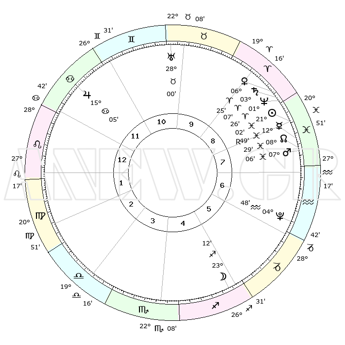 | | ΘΕΣΕΙΣ ΠΛΑΝΗΤΩΝ ΑΣΤΡΟΛΟΓΙΚΟΥ ΧΑΡΤΗ ΤΗΣ ΣΤΙΓΜΗΣ ΑΥΤΗΣ | | | | Πλανήτης | Ζώδιο | Μοίρες | Δεκαήμ. | Σε οίκο | Απόκλιση | | Ακμές των οίκων | | Ηλιος | Ιχθείς | 20°58' | Τρίτο | 8 | 03 S 35 | | 1ος | 09°22' | Λέων | | Σελήνη | Τοξότης | 22°28' | Τρίτο | 5 | 28 S 20 | | 2ος | 01°09' | Παρθένος | | Ερμής | Ιχθείς | 12°52'R | Δεύτερο | 8 | 03 S 50 | | 3ος | 27°28' | Παρθένος | | Αφροδίτη | Κριός | 06°20' | Πρώτο | 9 | 01 N 28 | | 4ος | 29°29' | Ζυγός | | Αρης | Ιχθείς | 07°03' | Πρώτο | 8 | 09 S 56 | | 5ος | 05°07' | Τοξότης | | Δίας | Καρκίνος | 15°05' | Δεύτερο | 12 | 22 N 56 | | 6ος | 09°22' | Αιγόκερως | | Κρόνος | Κριός | 03°07' | Πρώτο | 9 | 00 S 43 | | 7ος | 09°22' | Υδροχόος | | Ουρανός | Ταύρος | 28°00' | Τρίτο | 10 | 19 N 32 | | 8ος | 01°09' | Ιχθείς | | Ποσειδώνας | Κριός | 01°26' | Πρώτο | 9 | 00 S 38 | | 9ος | 27°28' | Ιχθείς | | Πλούτωνας | Υδροχόος | 04°48' | Πρώτο | 6 | 22 S 50 | | 10ος | 29°29' | Κριός | | Β. Δεσμός | Ιχθείς | 08°29' | Πρώτο | 8 | 08 S 23 | | 11ος | 05°07' | Δίδυμοι | | Ωροσκόπος | Λέων | 09°22' | Πρώτο | | | 12ος | 09°22' | Καρκίνος | | Μεσουράνημα | Κριός | 29°29' | Τρίτο | | | |
