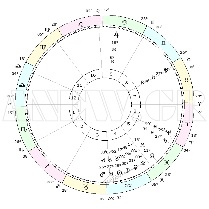 | | ΘΕΣΕΙΣ ΠΛΑΝΗΤΩΝ ΑΣΤΡΟΛΟΓΙΚΟΥ ΧΑΡΤΗ ΤΗΣ ΣΤΙΓΜΗΣ ΑΥΤΗΣ | | | | Πλανήτης | Ζώδιο | Μοίρες | Δεκαήμ. | Σε οίκο | Απόκλιση | | Ακμές των οίκων | | Ηλιος | Αιγόκερως | 27°54' | Τρίτο | 3 | 20 S 35 | | 1ος | 12°51' | Σκορπιός | | Σελήνη | Αιγόκερως | 18°30' | Δεύτερο | 3 | 26 S 07 | | 2ος | 12°09' | Τοξότης | | Ερμής | Αιγόκερως | 25°33' | Τρίτο | 3 | 22 S 56 | | 3ος | 15°22' | Αιγόκερως | | Αφροδίτη | Υδροχόος | 00°37' | Πρώτο | 3 | 21 S 03 | | 4ος | 20°29' | Υδροχόος | | Αρης | Αιγόκερως | 25°49' | Τρίτο | 3 | 21 S 57 | | 5ος | 23°01' | Ιχθείς | | Δίας | Καρκίνος | 19°05'R | Δεύτερο | 9 | 22 N 21 | | 6ος | 20°20' | Κριός | | Κρόνος | Ιχθείς | 27°29' | Τρίτο | 5 | 03 S 02 | | 7ος | 12°51' | Ταύρος | | Ουρανός | Ταύρος | 27°35'R | Τρίτο | 7 | 19 N 26 | | 8ος | 12°09' | Δίδυμοι | | Ποσειδώνας | Ιχθείς | 29°48' | Τρίτο | 5 | 01 S 18 | | 9ος | 15°22' | Καρκίνος | | Πλούτωνας | Υδροχόος | 03°15' | Πρώτο | 3 | 23 S 07 | | 10ος | 20°29' | Λέων | | Β. Δεσμός | Ιχθείς | 11°16' | Δεύτερο | 4 | 07 S 20 | | 11ος | 23°01' | Παρθένος | | Ωροσκόπος | Σκορπιός | 12°51' | Δεύτερο | | | 12ος | 20°20' | Ζυγός | | Μεσουράνημα | Λέων | 20°29' | Τρίτο | | | |