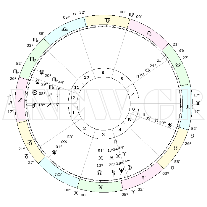 | | ΘΕΣΕΙΣ ΠΛΑΝΗΤΩΝ ΑΣΤΡΟΛΟΓΙΚΟΥ ΧΑΡΤΗ ΤΗΣ ΣΤΙΓΜΗΣ ΑΥΤΗΣ | | | | Πλανήτης | Ζώδιο | Μοίρες | Δεκαήμ. | Σε οίκο | Απόκλιση | | Ακμές των οίκων | | Ηλιος | Τοξότης | 08°14' | Πρώτο | 1 | 21 S 41 | | 1ος | 04°08' | Τοξότης | | Σελήνη | Κριός | 02°17' | Πρώτο | 4 | 02 N 20 | | 2ος | 05°52' | Αιγόκερως | | Ερμής | Σκορπιός | 20°44' | Τρίτο | 12 | 15 S 27 | | 3ος | 12°15' | Υδροχόος | | Αφροδίτη | Σκορπιός | 29°13' | Τρίτο | 12 | 19 S 16 | | 4ος | 18°21' | Ιχθείς | | Αρης | Τοξότης | 18°43' | Δεύτερο | 1 | 23 S 36 | | 5ος | 18°50' | Κριός | | Δίας | Καρκίνος | 24°35'R | Τρίτο | 8 | 21 N 21 | | 6ος | 13°20' | Ταύρος | | Κρόνος | Ιχθείς | 25°17' | Τρίτο | 4 | 04 S 03 | | 7ος | 04°08' | Δίδυμοι | | Ουρανός | Ταύρος | 29°05'R | Τρίτο | 6 | 19 N 45 | | 8ος | 05°52' | Καρκίνος | | Ποσειδώνας | Ιχθείς | 29°24'R | Τρίτο | 4 | 01 S 29 | | 9ος | 12°15' | Λέων | | Πλούτωνας | Υδροχόος | 01°53' | Πρώτο | 2 | 23 S 24 | | 10ος | 18°21' | Παρθένος | | Β. Δεσμός | Ιχθείς | 13°51' | Δεύτερο | 3 | 06 S 21 | | 11ος | 18°50' | Ζυγός | | Ωροσκόπος | Τοξότης | 04°08' | Πρώτο | | | 12ος | 13°20' | Σκορπιός | | Μεσουράνημα | Παρθένος | 18°21' | Δεύτερο | | | |