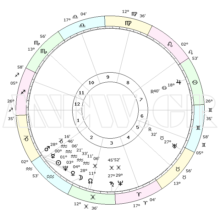 | | ΘΕΣΕΙΣ ΠΛΑΝΗΤΩΝ ΑΣΤΡΟΛΟΓΙΚΟΥ ΧΑΡΤΗ ΤΗΣ ΣΤΙΓΜΗΣ ΑΥΤΗΣ | | | | Πλανήτης | Ζώδιο | Μοίρες | Δεκαήμ. | Σε οίκο | Απόκλιση | | Ακμές των οίκων | | Ηλιος | Υδροχόος | 01°01' | Πρώτο | 2 | 19 S 56 | | 1ος | 01°46' | Τοξότης | | Σελήνη | Υδροχόος | 27°08' | Τρίτο | 3 | 13 S 30 | | 2ος | 03°09' | Αιγόκερως | | Ερμής | Υδροχόος | 00°38' | Πρώτο | 2 | 22 S 00 | | 3ος | 09°09' | Υδροχόος | | Αφροδίτη | Υδροχόος | 04°27' | Πρώτο | 2 | 20 S 15 | | 4ος | 15°13' | Ιχθείς | | Αρης | Αιγόκερως | 28°12' | Τρίτο | 2 | 21 S 30 | | 5ος | 16°02' | Κριός | | Δίας | Καρκίνος | 18°41'R | Δεύτερο | 8 | 22 N 25 | | 6ος | 10°51' | Ταύρος | | Κρόνος | Ιχθείς | 27°45' | Τρίτο | 4 | 02 S 55 | | 7ος | 01°46' | Δίδυμοι | | Ουρανός | Ταύρος | 27°33'R | Τρίτο | 6 | 19 N 25 | | 8ος | 03°09' | Καρκίνος | | Ποσειδώνας | Ιχθείς | 29°52' | Τρίτο | 4 | 01 S 16 | | 9ος | 09°09' | Λέων | | Πλούτωνας | Υδροχόος | 03°21' | Πρώτο | 2 | 23 S 05 | | 10ος | 15°13' | Παρθένος | | Β. Δεσμός | Ιχθείς | 11°06' | Δεύτερο | 3 | 07 S 24 | | 11ος | 16°02' | Ζυγός | | Ωροσκόπος | Τοξότης | 01°46' | Πρώτο | | | 12ος | 10°51' | Σκορπιός | | Μεσουράνημα | Παρθένος | 15°13' | Δεύτερο | | | |