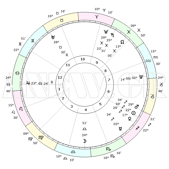 | | ΘΕΣΕΙΣ ΠΛΑΝΗΤΩΝ ΑΣΤΡΟΛΟΓΙΚΟΥ ΧΑΡΤΗ ΤΗΣ ΣΤΙΓΜΗΣ ΑΥΤΗΣ | | | | Πλανήτης | Ζώδιο | Μοίρες | Δεκαήμ. | Σε οίκο | Απόκλιση | | Ακμές των οίκων | | Ηλιος | Τοξότης | 22°41' | Τρίτο | 9 | 23 S 14 | | 1ος | 21°57' | Ιχθείς | | Σελήνη | Ζυγός | 21°24' | Τρίτο | 7 | 11 S 14 | | 2ος | 04°04' | Ταύρος | | Ερμής | Τοξότης | 03°11' | Πρώτο | 9 | 19 S 13 | | 3ος | 02°45' | Δίδυμοι | | Αφροδίτη | Τοξότης | 17°07' | Δεύτερο | 9 | 22 S 37 | | 4ος | 25°28' | Δίδυμοι | | Αρης | Τοξότης | 29°21' | Τρίτο | 10 | 24 S 12 | | 5ος | 17°28' | Καρκίνος | | Δίας | Καρκίνος | 23°25'R | Τρίτο | 5 | 21 N 36 | | 6ος | 13°41' | Λέων | | Κρόνος | Ιχθείς | 25°31' | Τρίτο | 1 | 03 S 55 | | 7ος | 21°57' | Παρθένος | | Ουρανός | Ταύρος | 28°31'R | Τρίτο | 2 | 19 N 38 | | 8ος | 04°04' | Σκορπιός | | Ποσειδώνας | Ιχθείς | 29°23' | Τρίτο | 1 | 01 S 29 | | 9ος | 02°45' | Τοξότης | | Πλούτωνας | Υδροχόος | 02°14' | Πρώτο | 11 | 23 S 20 | | 10ος | 25°28' | Τοξότης | | Β. Δεσμός | Ιχθείς | 13°06' | Δεύτερο | 12 | 06 S 38 | | 11ος | 17°28' | Αιγόκερως | | Ωροσκόπος | Ιχθείς | 21°57' | Τρίτο | | | 12ος | 13°41' | Υδροχόος | | Μεσουράνημα | Τοξότης | 25°28' | Τρίτο | | | |