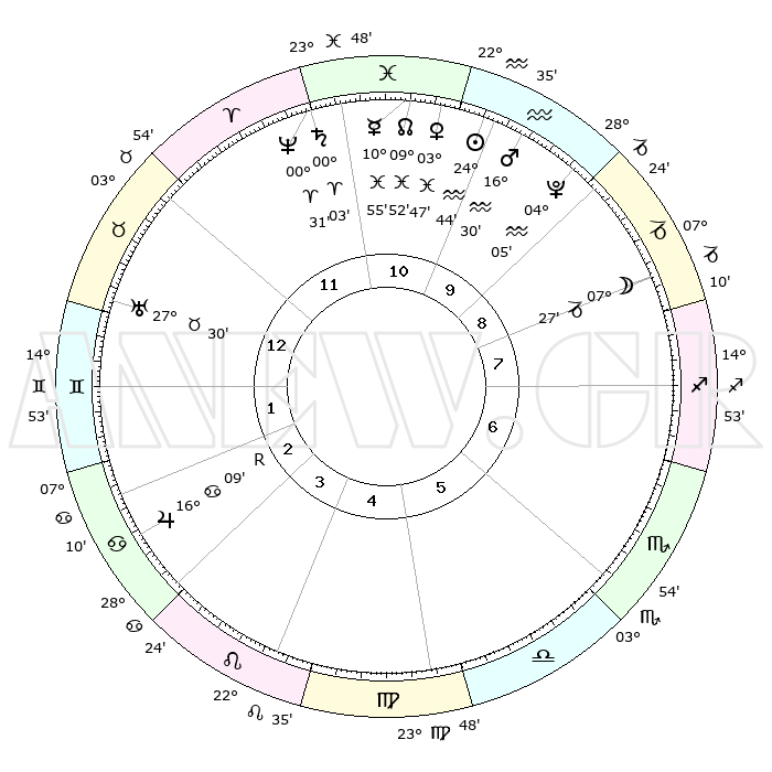 | | ΘΕΣΕΙΣ ΠΛΑΝΗΤΩΝ ΑΣΤΡΟΛΟΓΙΚΟΥ ΧΑΡΤΗ ΤΗΣ ΣΤΙΓΜΗΣ ΑΥΤΗΣ | | | | Πλανήτης | Ζώδιο | Μοίρες | Δεκαήμ. | Σε οίκο | Απόκλιση | | Ακμές των οίκων | | Ηλιος | Υδροχόος | 24°39' | Τρίτο | 11 | 13 S 18 | | 1ος | 11°45' | Ταύρος | | Σελήνη | Αιγόκερως | 06°31' | Πρώτο | 9 | 27 S 56 | | 2ος | 10°49' | Δίδυμοι | | Ερμής | Ιχθείς | 10°48' | Δεύτερο | 11 | 07 S 47 | | 3ος | 03°18' | Καρκίνος | | Αφροδίτη | Ιχθείς | 03°41' | Πρώτο | 11 | 11 S 31 | | 4ος | 25°10' | Καρκίνος | | Αρης | Υδροχόος | 16°26' | Δεύτερο | 10 | 16 S 56 | | 5ος | 20°53' | Λέων | | Δίας | Καρκίνος | 16°09'R | Δεύτερο | 3 | 22 N 47 | | 6ος | 25°57' | Παρθένος | | Κρόνος | Κριός | 00°03' | Πρώτο | 12 | 01 S 57 | | 7ος | 11°45' | Σκορπιός | | Ουρανός | Ταύρος | 27°30' | Τρίτο | 1 | 19 N 25 | | 8ος | 10°49' | Τοξότης | | Ποσειδώνας | Κριός | 00°31' | Πρώτο | 12 | 01 S 00 | | 9ος | 03°18' | Αιγόκερως | | Πλούτωνας | Υδροχόος | 04°05' | Πρώτο | 10 | 22 S 57 | | 10ος | 25°10' | Αιγόκερως | | Β. Δεσμός | Ιχθείς | 09°52' | Πρώτο | 11 | 07 S 52 | | 11ος | 20°53' | Υδροχόος | | Ωροσκόπος | Ταύρος | 11°45' | Δεύτερο | | | 12ος | 25°57' | Ιχθείς | | Μεσουράνημα | Αιγόκερως | 25°10' | Τρίτο | | | |