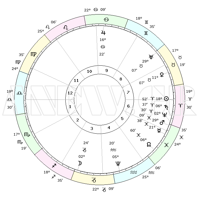 | | ΘΕΣΕΙΣ ΠΛΑΝΗΤΩΝ ΑΣΤΡΟΛΟΓΙΚΟΥ ΧΑΡΤΗ ΤΗΣ ΣΤΙΓΜΗΣ ΑΥΤΗΣ | | | | Πλανήτης | Ζώδιο | Μοίρες | Δεκαήμ. | Σε οίκο | Απόκλιση | | Ακμές των οίκων | | Ηλιος | Κριός | 18°48' | Δεύτερο | 7 | 07 N 22 | | 1ος | 29°41' | Παρθένος | | Σελήνη | Αιγόκερως | 01°36' | Πρώτο | 4 | 28 S 10 | | 2ος | 26°15' | Ζυγός | | Ερμής | Ιχθείς | 21°33' | Τρίτο | 6 | 05 S 24 | | 3ος | 26°40' | Σκορπιός | | Αφροδίτη | Ταύρος | 11°02' | Δεύτερο | 8 | 15 N 01 | | 4ος | 29°38' | Τοξότης | | Αρης | Ιχθείς | 29°05' | Τρίτο | 6 | 01 S 18 | | 5ος | 02°37' | Υδροχόος | | Δίας | Καρκίνος | 16°22' | Δεύτερο | 10 | 22 N 48 | | 6ος | 03°04' | Ιχθείς | | Κρόνος | Κριός | 06°36' | Πρώτο | 7 | 00 N 40 | | 7ος | 29°41' | Ιχθείς | | Ουρανός | Ταύρος | 29°07' | Τρίτο | 9 | 19 N 47 | | 8ος | 26°15' | Κριός | | Ποσειδώνας | Κριός | 02°30' | Πρώτο | 7 | 00 S 13 | | 9ος | 26°40' | Ταύρος | | Πλούτωνας | Υδροχόος | 05°20' | Πρώτο | 5 | 22 S 47 | | 10ος | 29°38' | Δίδυμοι | | Β. Δεσμός | Ιχθείς | 06°60' | Πρώτο | 6 | 08 S 56 | | 11ος | 02°37' | Λέων | | Ωροσκόπος | Παρθένος | 29°41' | Τρίτο | | | 12ος | 03°04' | Παρθένος | | Μεσουράνημα | Δίδυμοι | 29°38' | Τρίτο | | | |